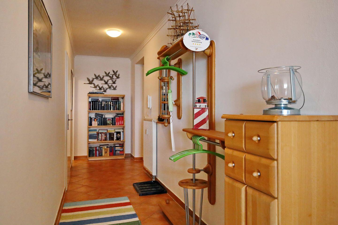 Die Ferienwohnung verfügt über ein sehr modernes gefliestes Duschbad mit ebenerdiger Dusche und einem WC. Für deine Waschutensilien findest du genügend Platz auf den Ablageflächen. Ein Föhn komplettiert die Ausstattung des Bades. In den Schlafzimmern wurde Vinylboden in Holzoptik verlegt, in allen anderen Räumen findest du Fliesen vor. In dieser Nichtraucherwohnung sind Haustiere nicht erlaubt. Das Grillen ist im Interesse der Mitbewohner des Hauses Meeresblick auf dem Balkon nicht gestattet.