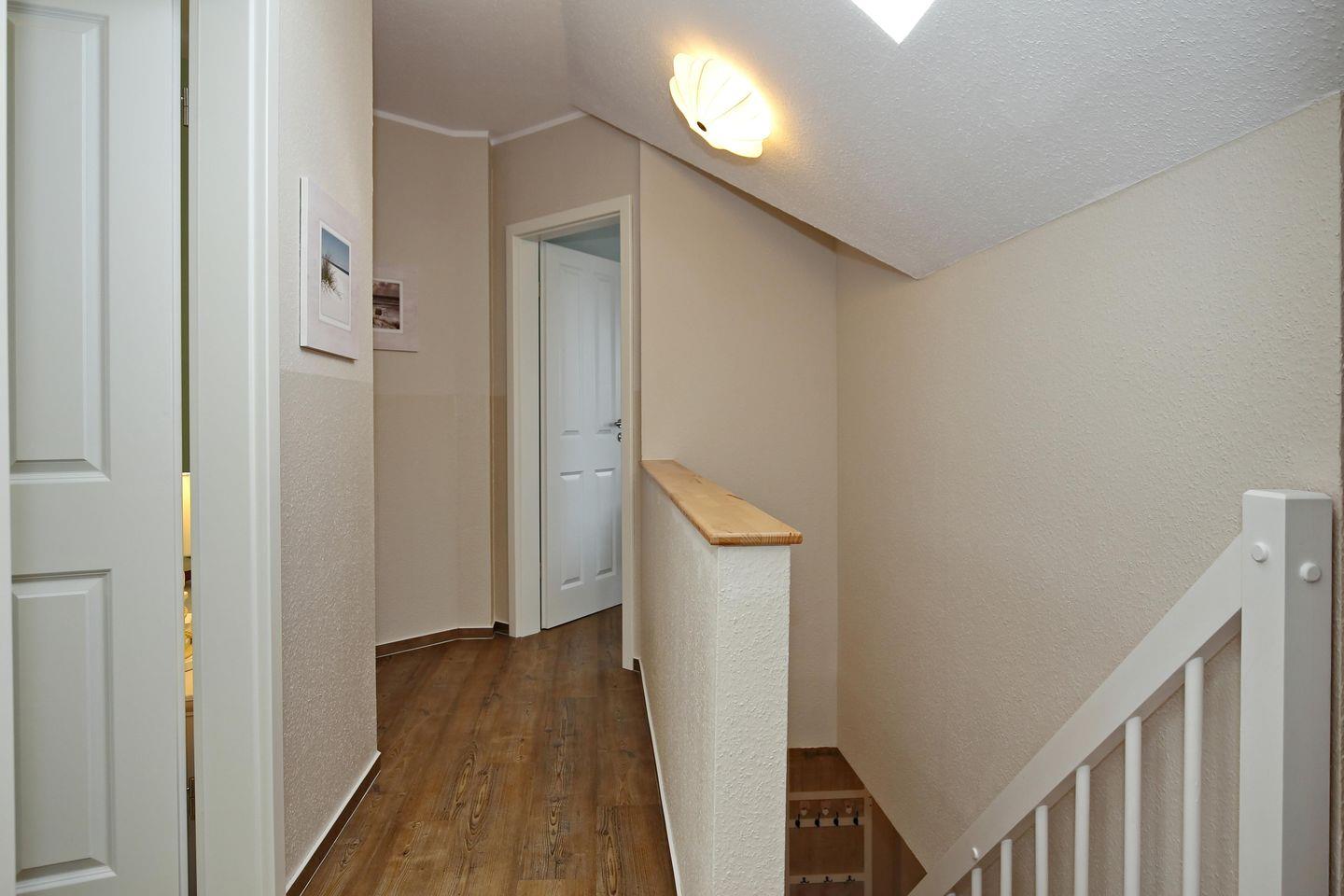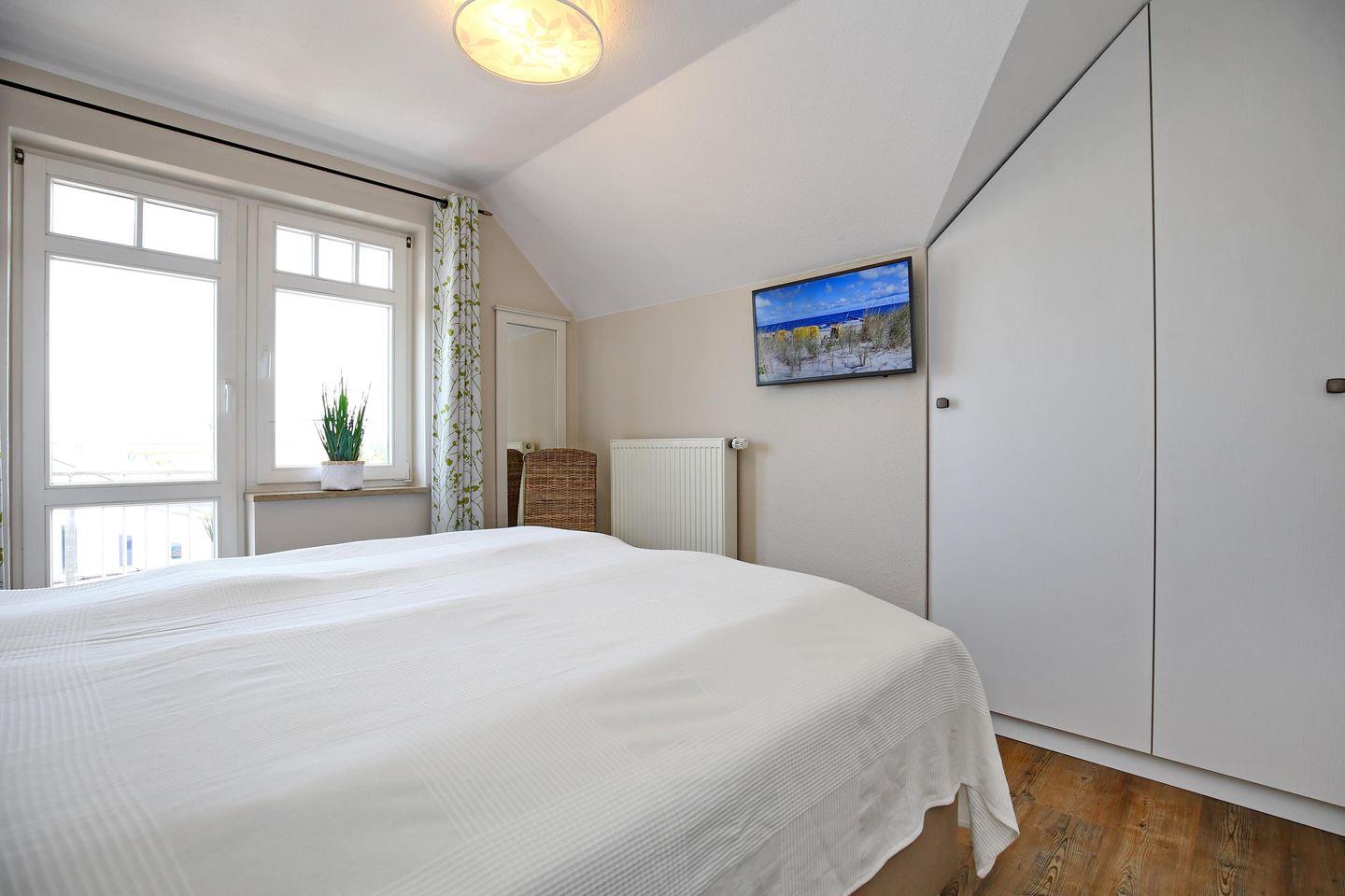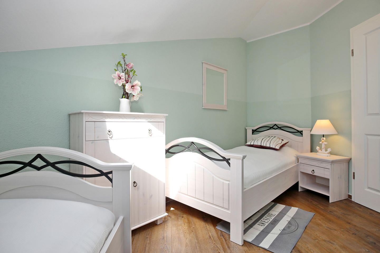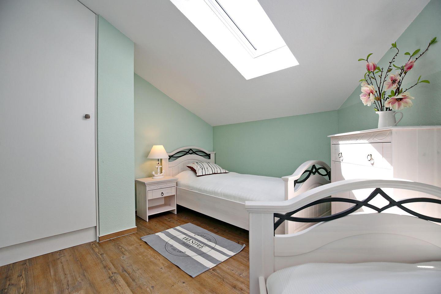 Im unteren Schlafzimmer der Ferienwohnung befindet sich ein Boxspringbett (180 cm x 200 cm) und genügend Verstaumöglichkeiten für deine Urlaubsgarderobe. In den oberen Schlafzimmern findest du im ersten Zimmer ein Doppelbett (2x80 cm x 200 cm) vor und im zweiten Zimmer zwei Einzelbetten (je 90 cm x 200 cm).