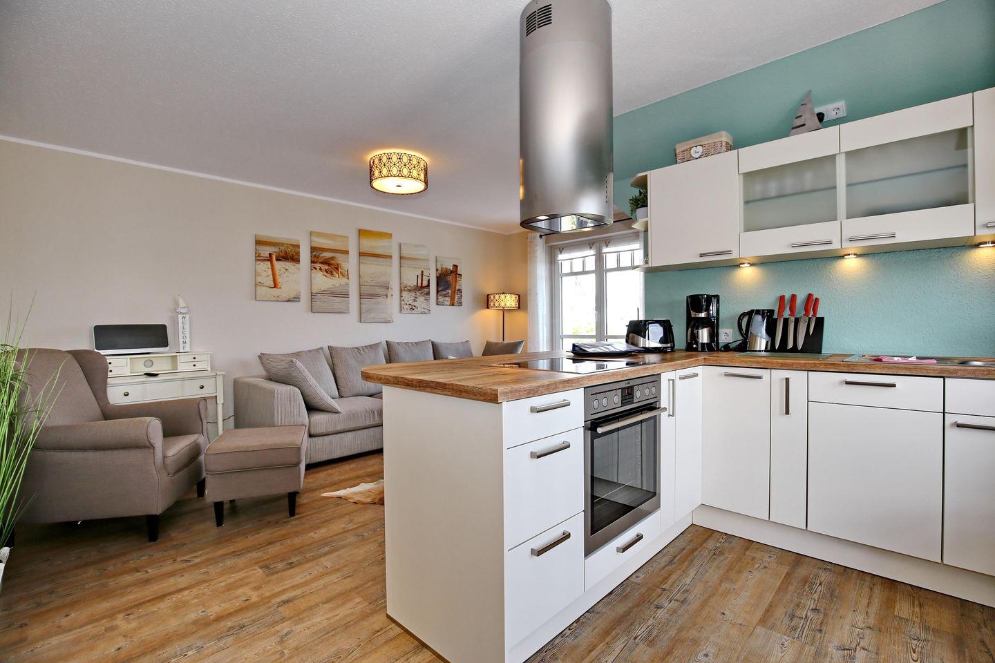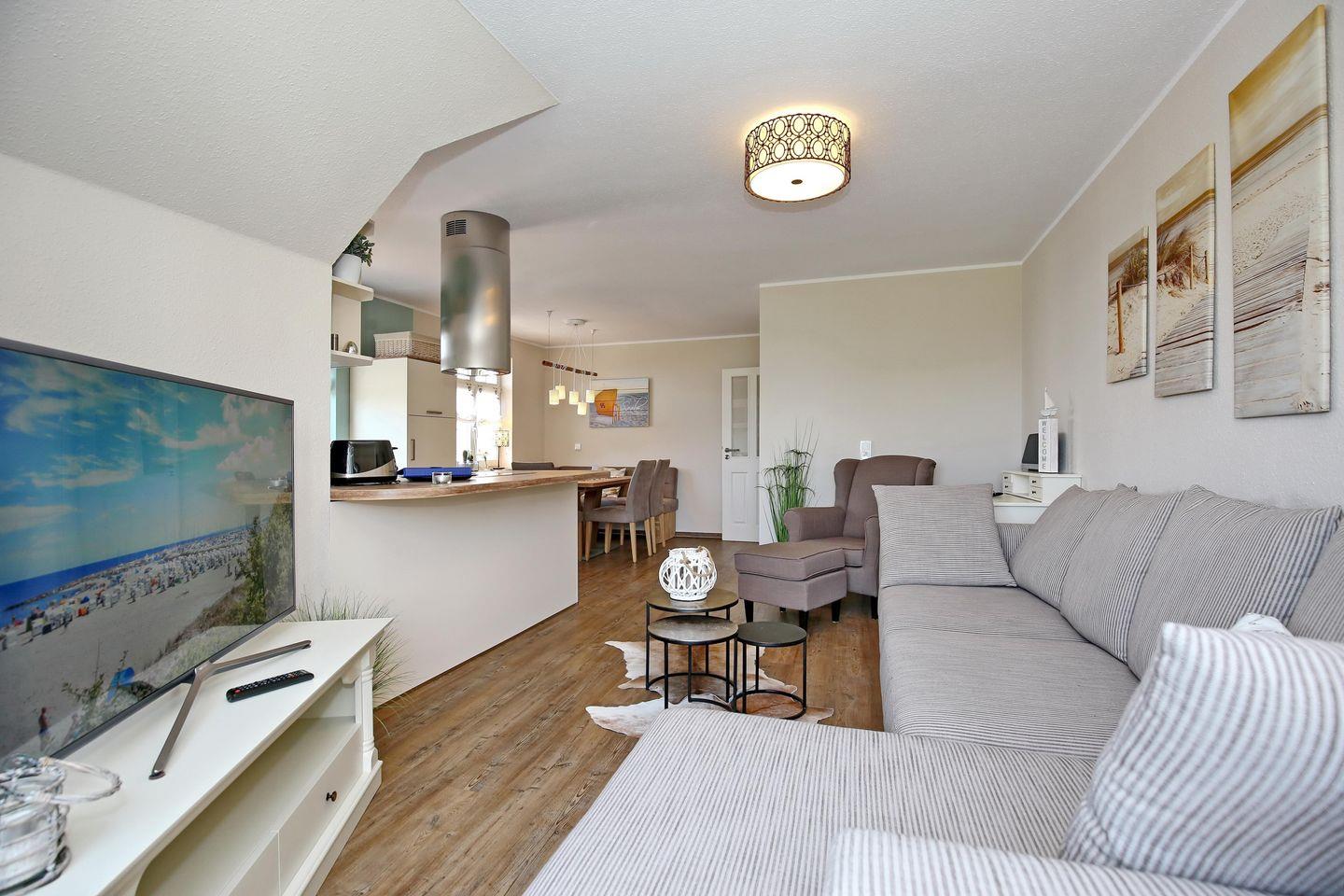 Der offene Wohn- und Essbereich der Ferienwohnung verfügt über ein großes Lounge-Sofa sowie einen separaten Sessel, einen Flachbild-TV und eine Musikanlage mit Bluetooth. Zusätzlich steht dir kostenloses WLAN zur Verfügung. Die gemütliche Essecke lädt zum Verweilen bei den gemeinsamen Mahlzeiten oder netten Spieleabenden ein.