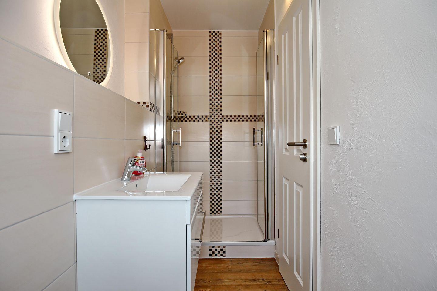 Die zwei Bäder im Ober- und Untergeschoss verfügen je über eine Dusche, ein Waschbecken und ein WC und haben genügend Ablageflächen für deine Waschutensilien.