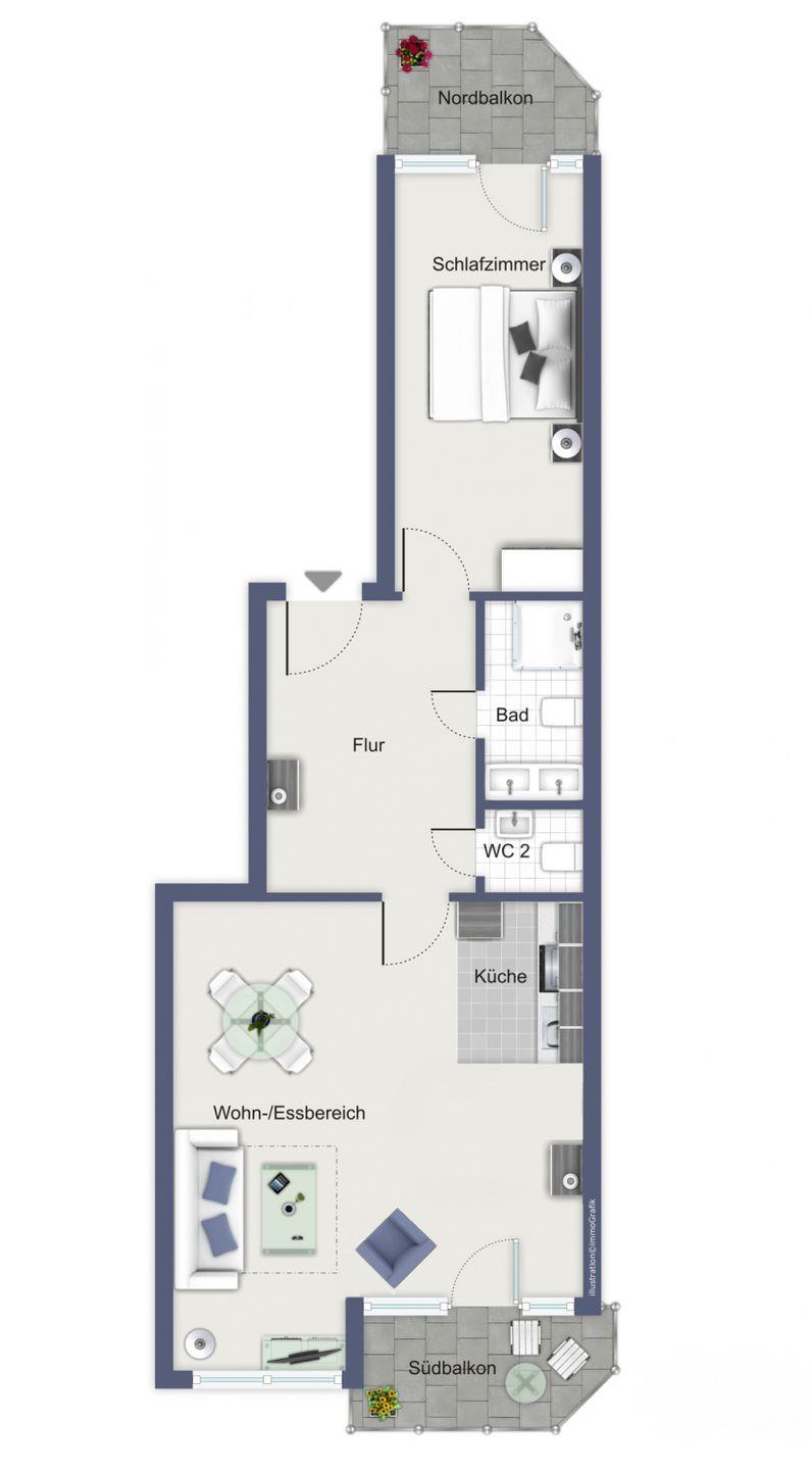 Die Ferienwohnung 325 in der Villa Hanse ist eine 2-Zimmer-Wohnung mit einer Größe von etwa 49 m². Zu der Wohnung gehören zwei Balkone.