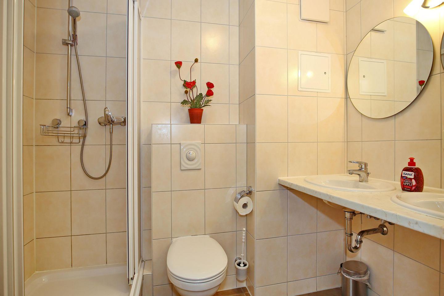 Die Ferienwohnung verfügt über ein gefliestes Duschbad mit WC und zwei Handwaschbecken, sowie einem Gäste-WC. Für Ihre Waschutensilien finden Sie genügend Ablagefläche. In der gesamten Wohnung wurde Parkett verlegt, an der Küchenzeile wurde gefliest. In dieser Nichtraucherwohnung sind Haustiere nicht erlaubt.