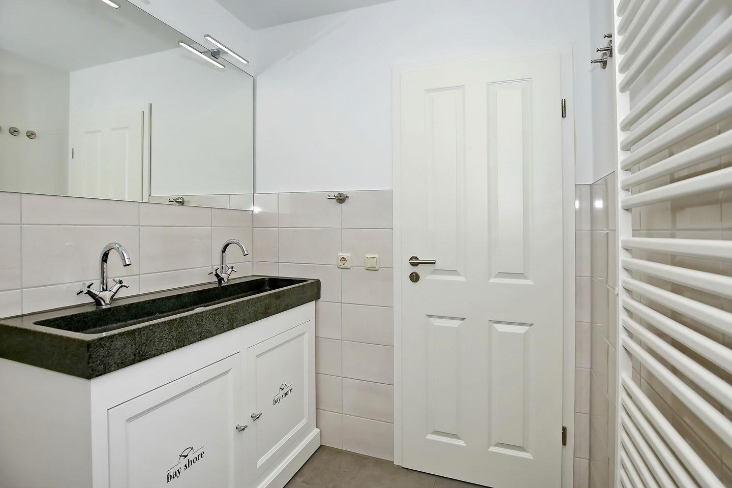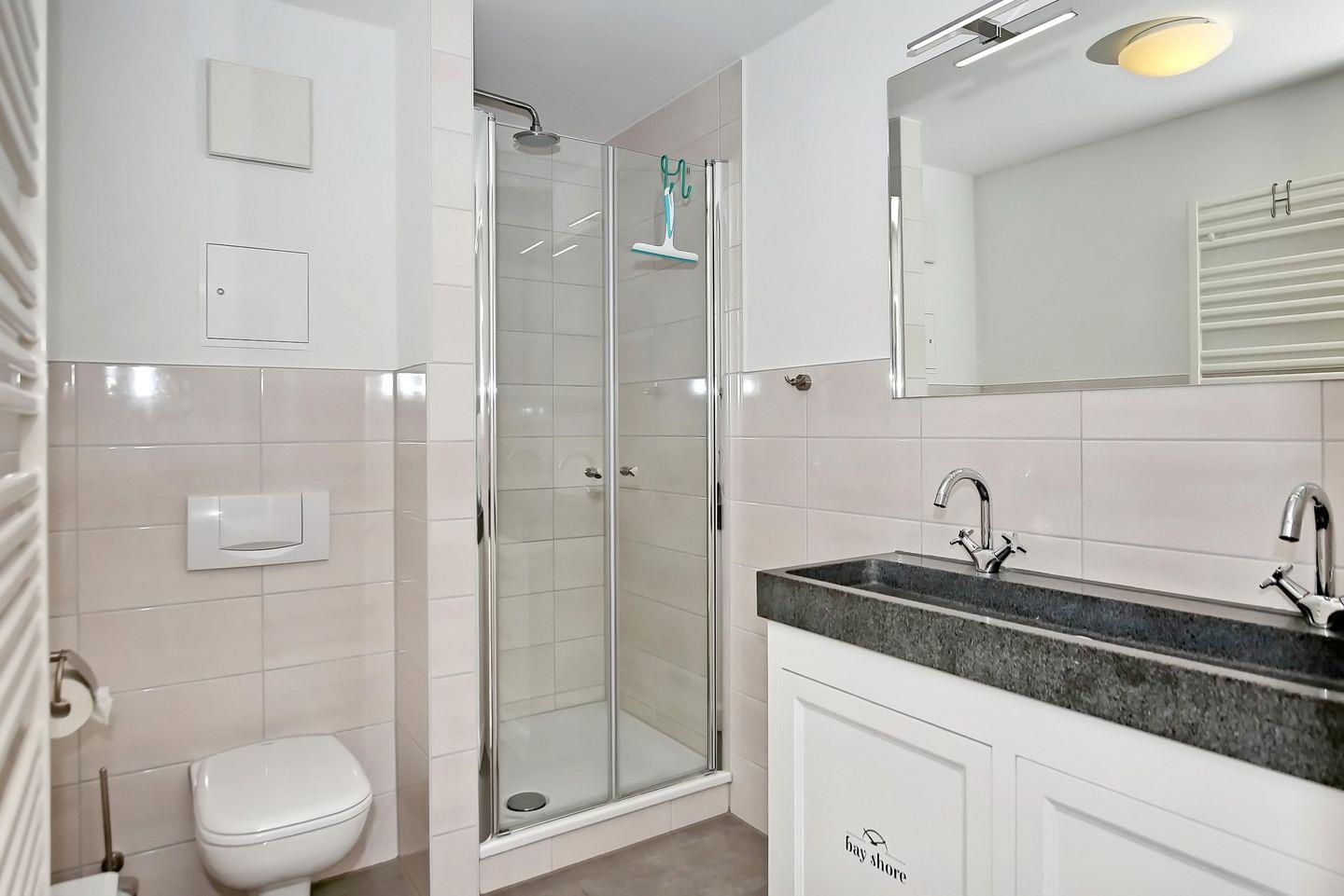 Die Ferienwohnung verfügt über ein gefliestes Duschbad mit WC und zwei Handwaschbecken. Für deine Waschutensilien findest du genügend Ablagefläche. In dieser Nichtraucherwohnung sind Haustiere nicht erlaubt.