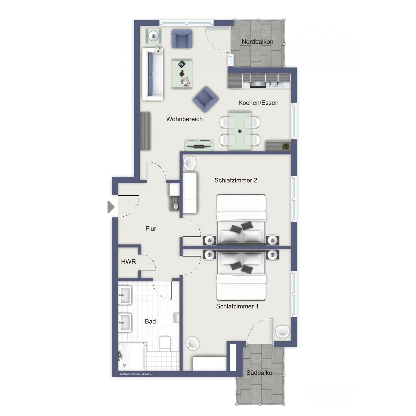 Deine moderne Ferienwohnung befindet sich im 2. Obergeschoss. Mit einer Größe von 57 m² bietet die Wohnung mit einem Wohn- und Essbereich, zwei geräumigen Schlafzimmern, einer Küchenzeile und einem Duschbad viel Platz für einen erholsamen Urlaub am Ostseestrand. Die Entfernung zum Strand beträgt etwa 100 Meter.