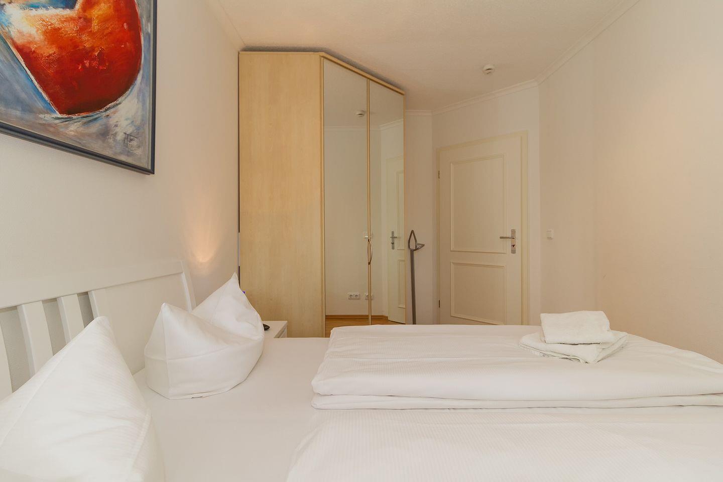 Das Apartment verfügt über 2 Schlafzimmer mit Doppelbett bzw. Einzelbett, die mit Laminat ausgestattet und zum Innenhof ausgerichtet sind; der Wohnbereich mit TV-HiFi-Anlage und DVD-Player ist gefliest.