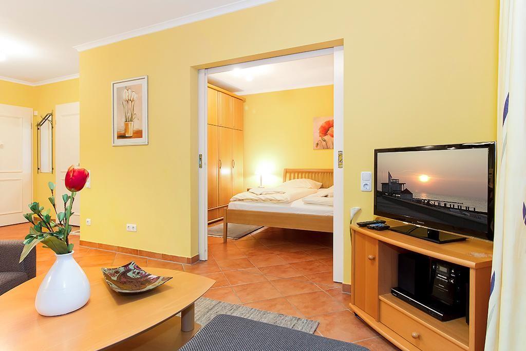 Die Gestaltung des gefliesten Nichtraucher-Apartments ergibt sich aus einem Schlafzimmer mit Doppelbett, einem Wohnbereich mit angrenzender Terrasse in Südlage und einem Bad mit einer ebenerdigen Dusche.