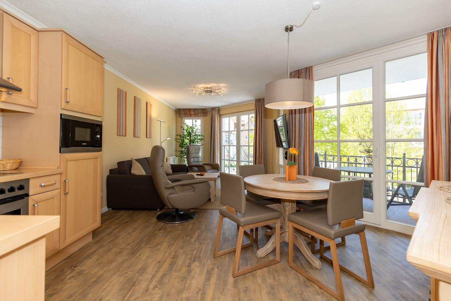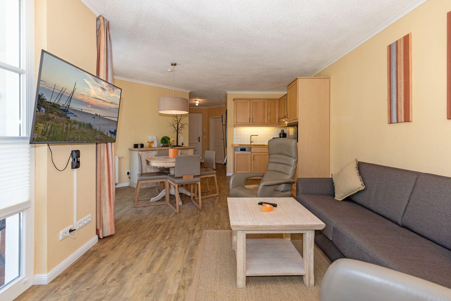 Das 60 m² große 3-Zimmer-Apartment bietet Platz für bis zu 4 Personen. Besonders hervorzuheben ist die direkte Strandlage der Apartmentanlage. Von hier aus seid ihr in nur wenigen Gehminuten am kilometerlangen, weißen Ostseestand.