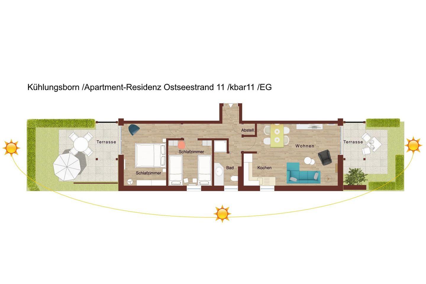 Das 65 m² große 3-Zimmer-Apartment ist für bis zu 4 Personen geeignet. Besonders hervorzuheben ist die zentrale und strandnahe Lage in Kühlungsborn-West und gleich zwei Terrassen mit eigenem Gartenzugang (1x nach Osten gelegen mit seitlichem Meerblick, 1 x nach Westen gelegen). So könnt ihr bereits beim Frühstück die Morgensonne genießen und euren Urlaubstag bei Sonnenuntergang gemütlich ausklingen lassen.