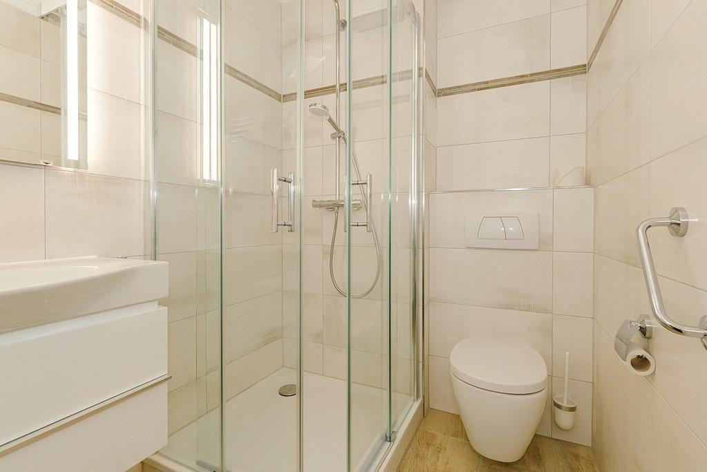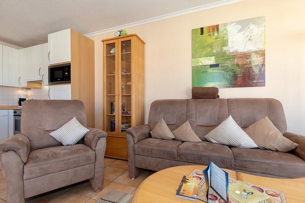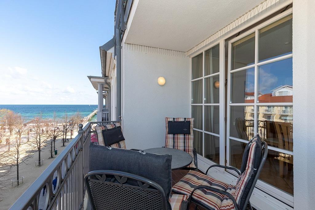 Zum Apartment gehören 2 Schlafbereiche, mit Laminat ausgelegt, Boxspringbett (1,80 x 2,00) mit Topper bzw. Etagenbett und verstellbarem Lattenrost und ein Wohnbereich mit Süd-West-Balkon. Der Balkon mit seitlichem Meerblick liegt Richtung Seebrücke bzw. Strandpromenade.