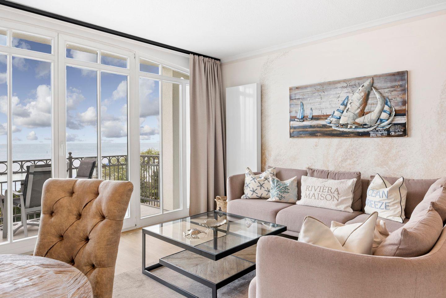 Die komfortable Ferienwohnung liegt im 3. Obergeschoss auf der Nordseite der Anlage und direkt am Strand und Yachthafen von Kühlungsborn.