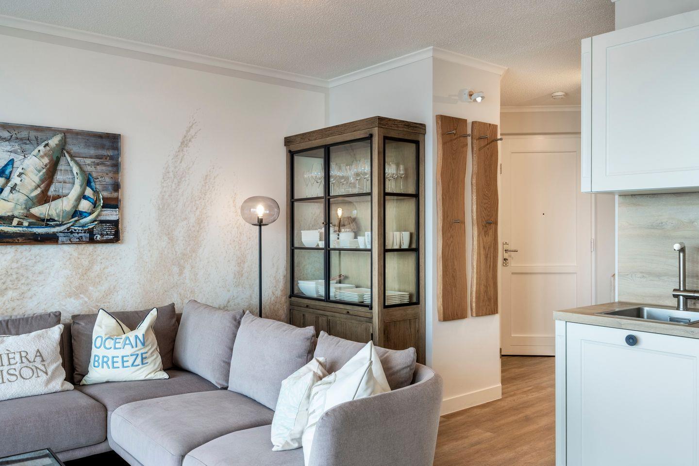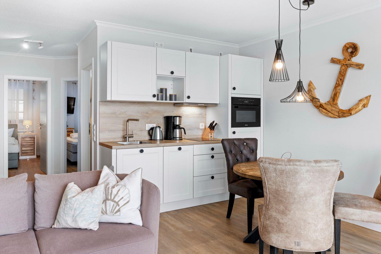 Zum Interieur eurer Ferienwohnung zählen eine voll ausgestattete offene Küche mit Backofen und integrierter Mikrowelle, Geschirrspüler, Nespressomaschine, Bügeleisen und Bügelbrett sowie ein Föhn.