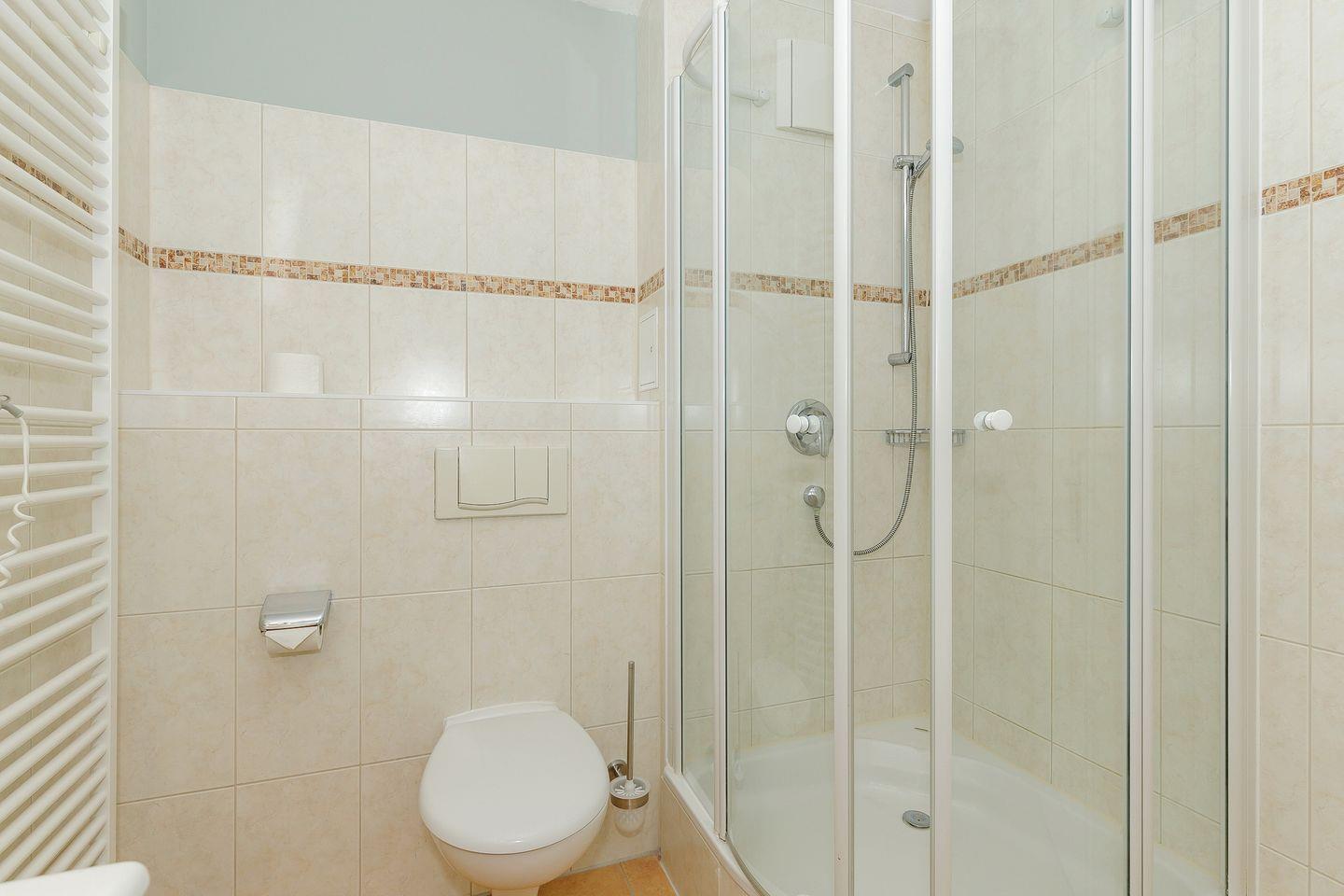 Das Badezimmer verfügt über eine große Eck-Dusche, WC, Waschtisch, Föhn, Kosmetikspiegel und Handtuchheizkörper.