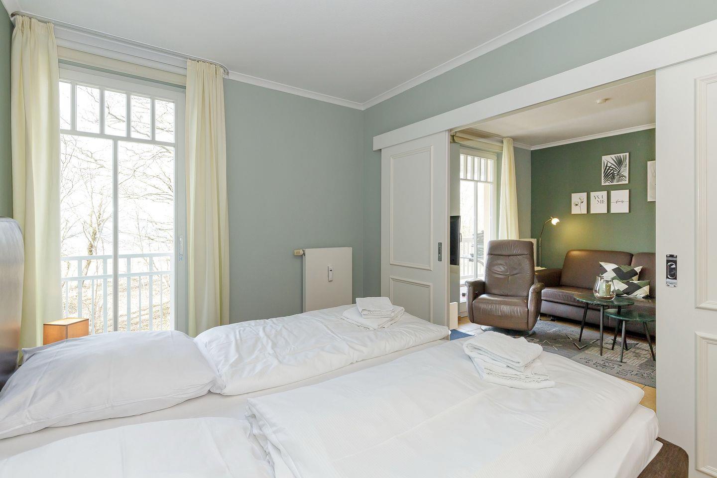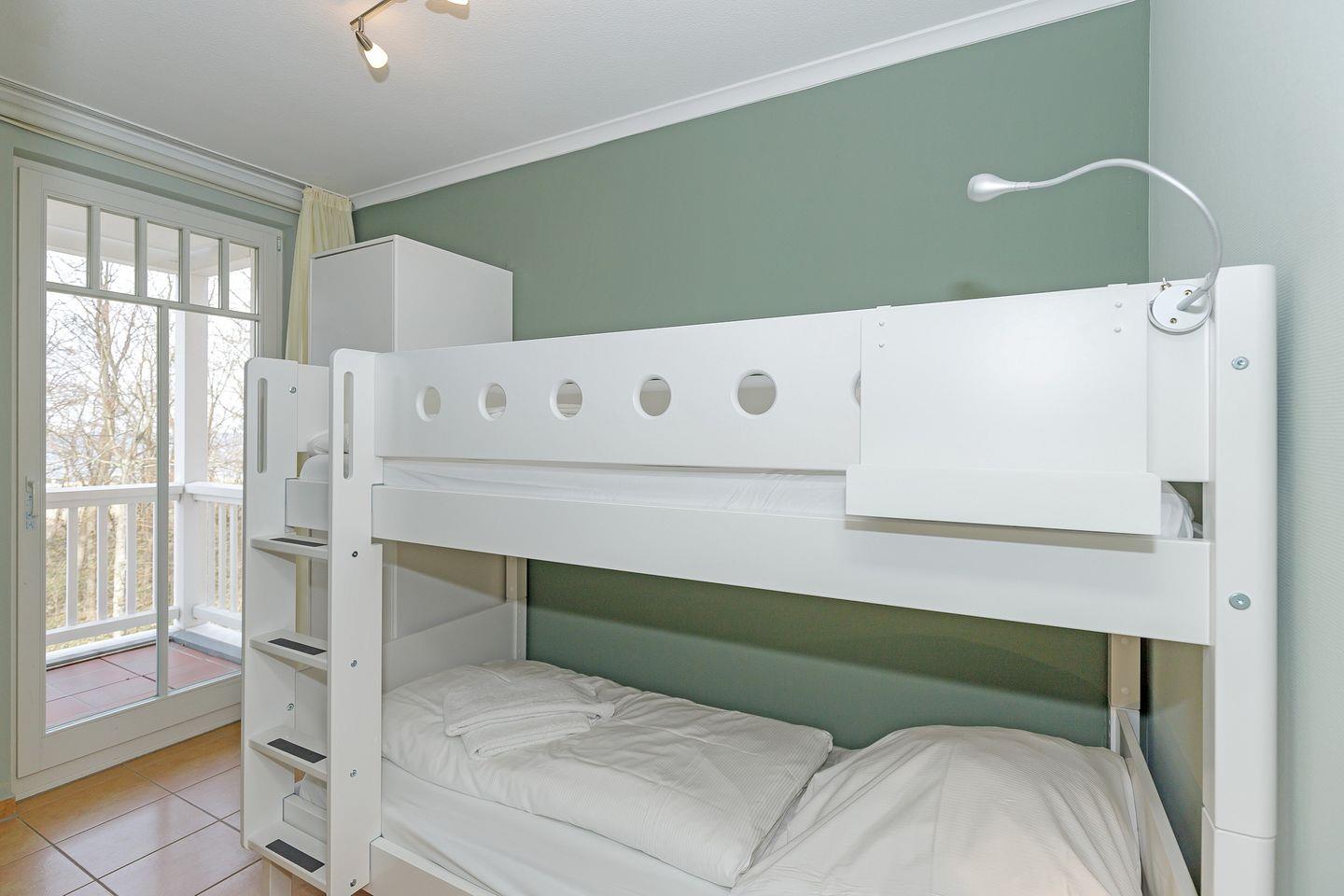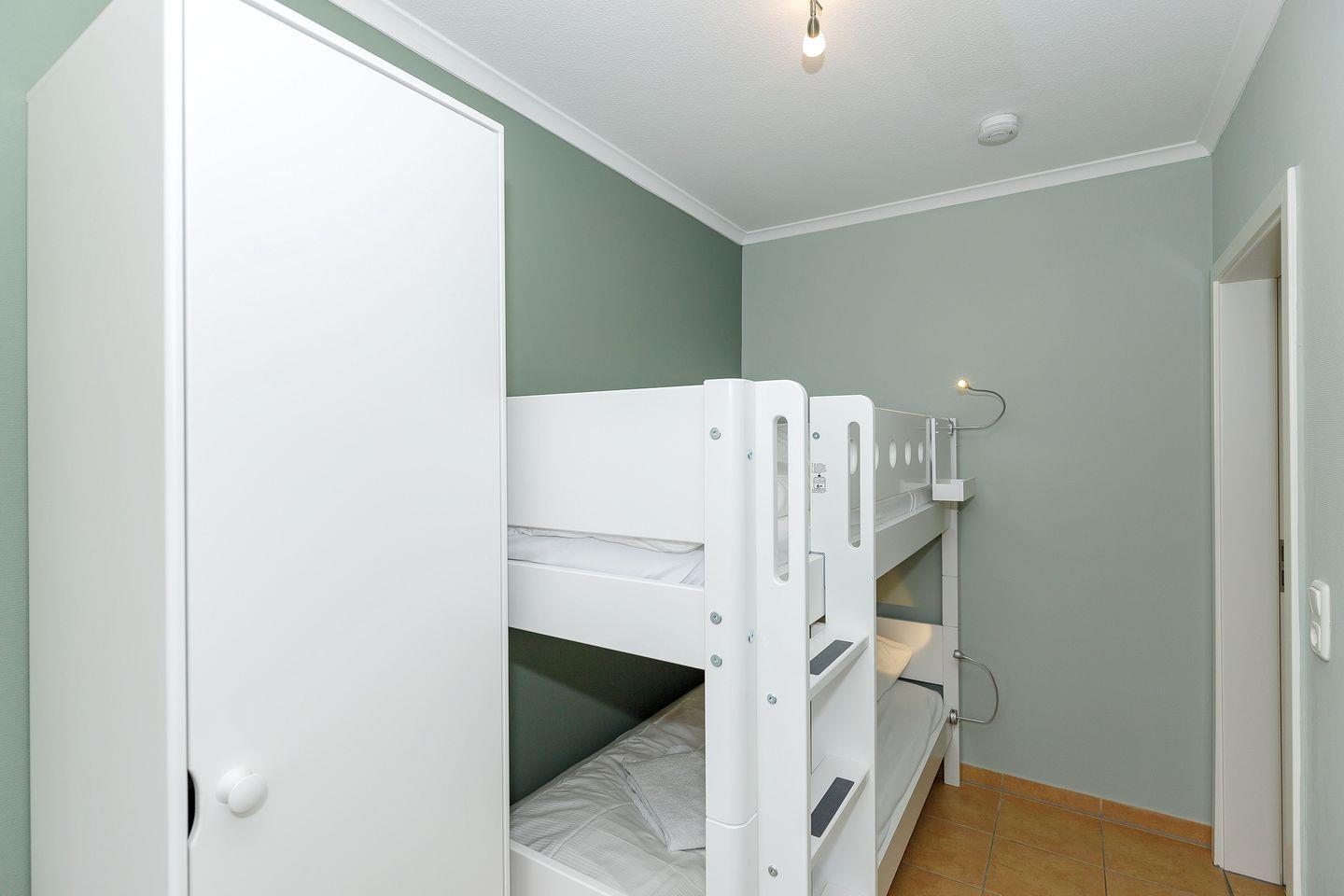Das liebevoll gestaltete Nichtraucher-Apartment ist durchgängig gefliest und verfügt über bodentiefe Fester, kostenfreies WLAN und eine voll ausgestattete offene Küche mit Geschirrspüler, Kühlschrank mit Gefrierfach, Kaffeemaschine, Toaster, Wasserkocher, Backofen und Mikrowelle sowie über einen Essbereich. Im angrenzenden Wohnbereich befindet sich eine hochwertige Ledersitzgruppe und ein Flatscreen-TV. Zwei separate Schlafzimmer stehen euch zur Verfügung und sind mit einem modernen Boxspringbett (1,80 x 2,00 m) bzw. mit einem Etagenbett für zwei Personen ausgestattet.