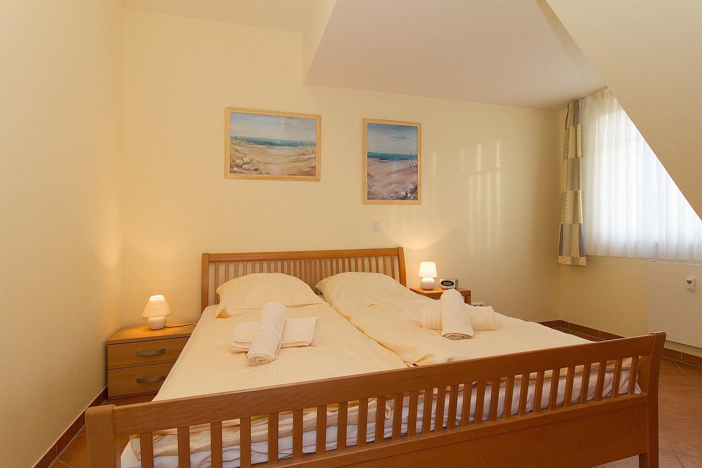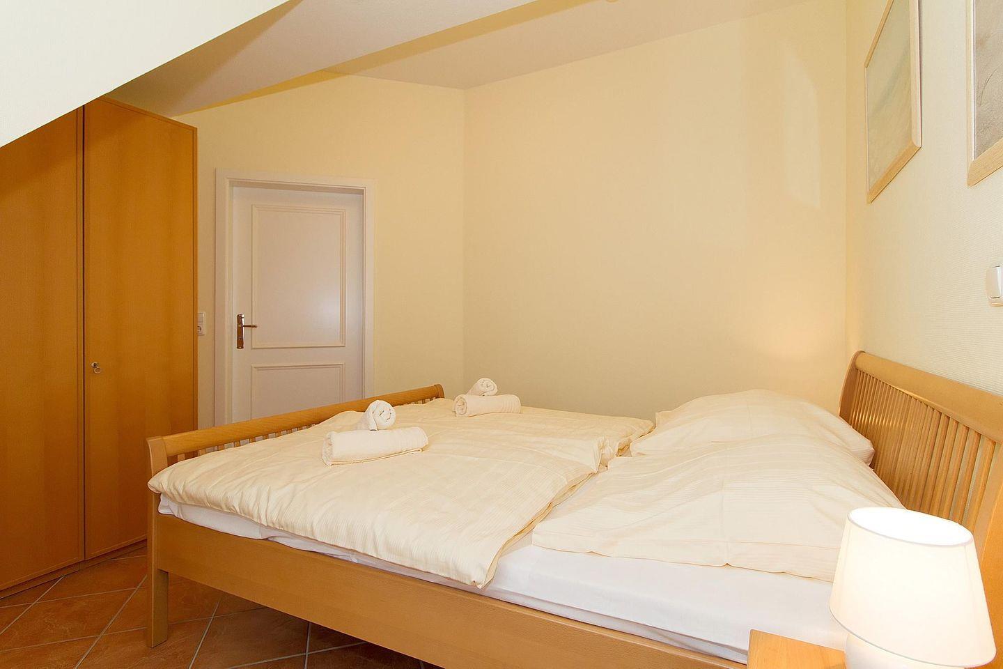 Im kombinierten Wohn-Essbereich stehen euch eine Doppelschlafcouch (1,40 m x 2,00 m), ein Flatscreen-TV, ein DVD-Player und eine Mini-HiFi Anlage zur Verfügung. Durch die großen Fenster und die exponierte Lage im Dachgeschoss ist die Wohnung besonders gemütlich und lichtdurchflutet. Vom Wohn-Essbereich aus habt ihr Zugang zum sonnenreichen und mit Gartenmöbeln ausgestatteten Balkon in Südlage. Zwei separate Schlafzimmer stehen euch zur Verfügung; eines davon mit Doppelbett (2 x 0,80 x 2,00), ein weiteres mit einem Einzelbett (0,90 x 2,00). Ein Kinderbett kann gegen Entgelt aufgestellt werden und auf Wunsch könnt ihr einen Hochstuhl hinzubuchen. Das Badezimmer bietet euch Waschtisch, WC, Dusche, Föhn und Kosmetikspiegel.