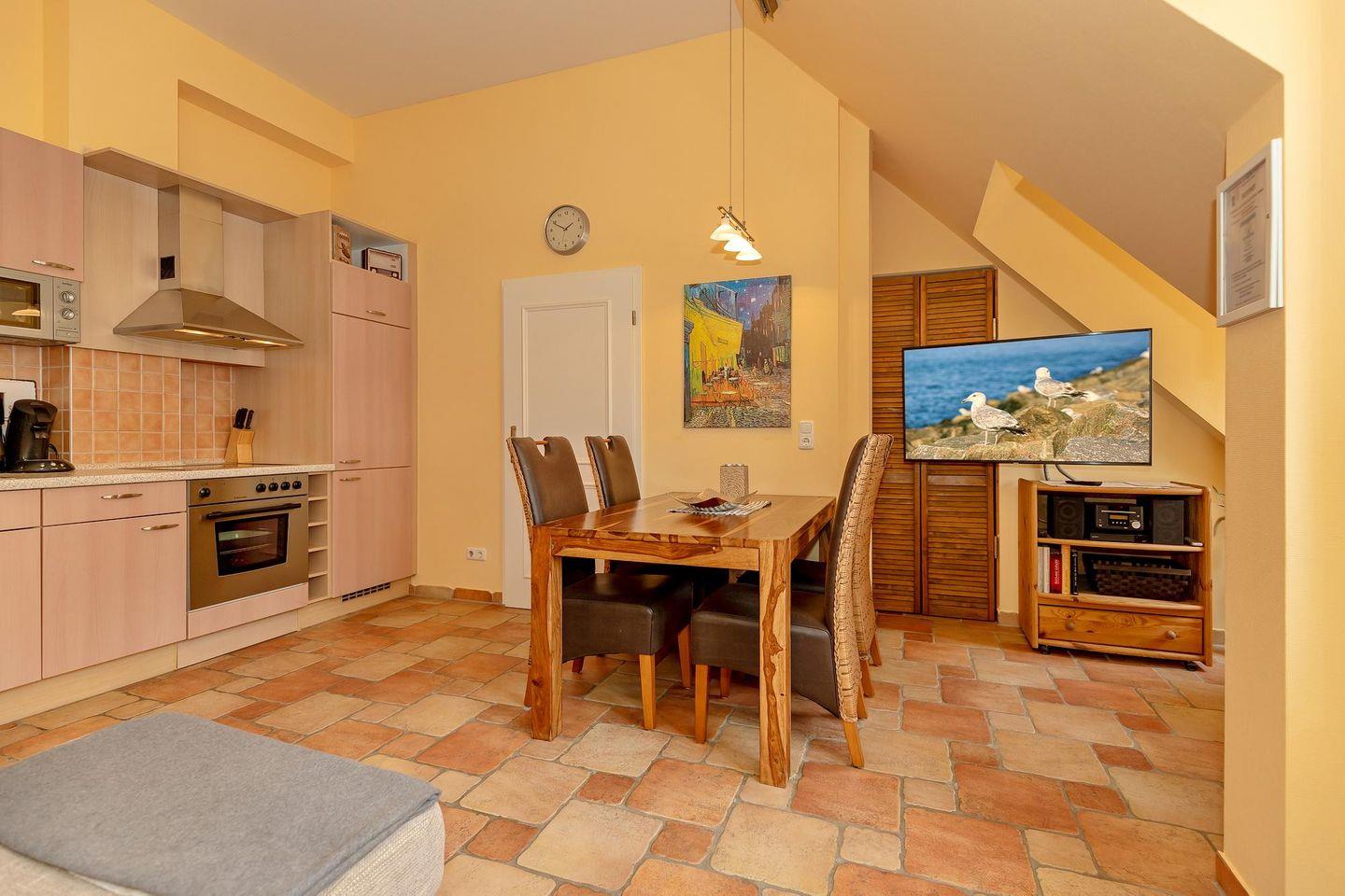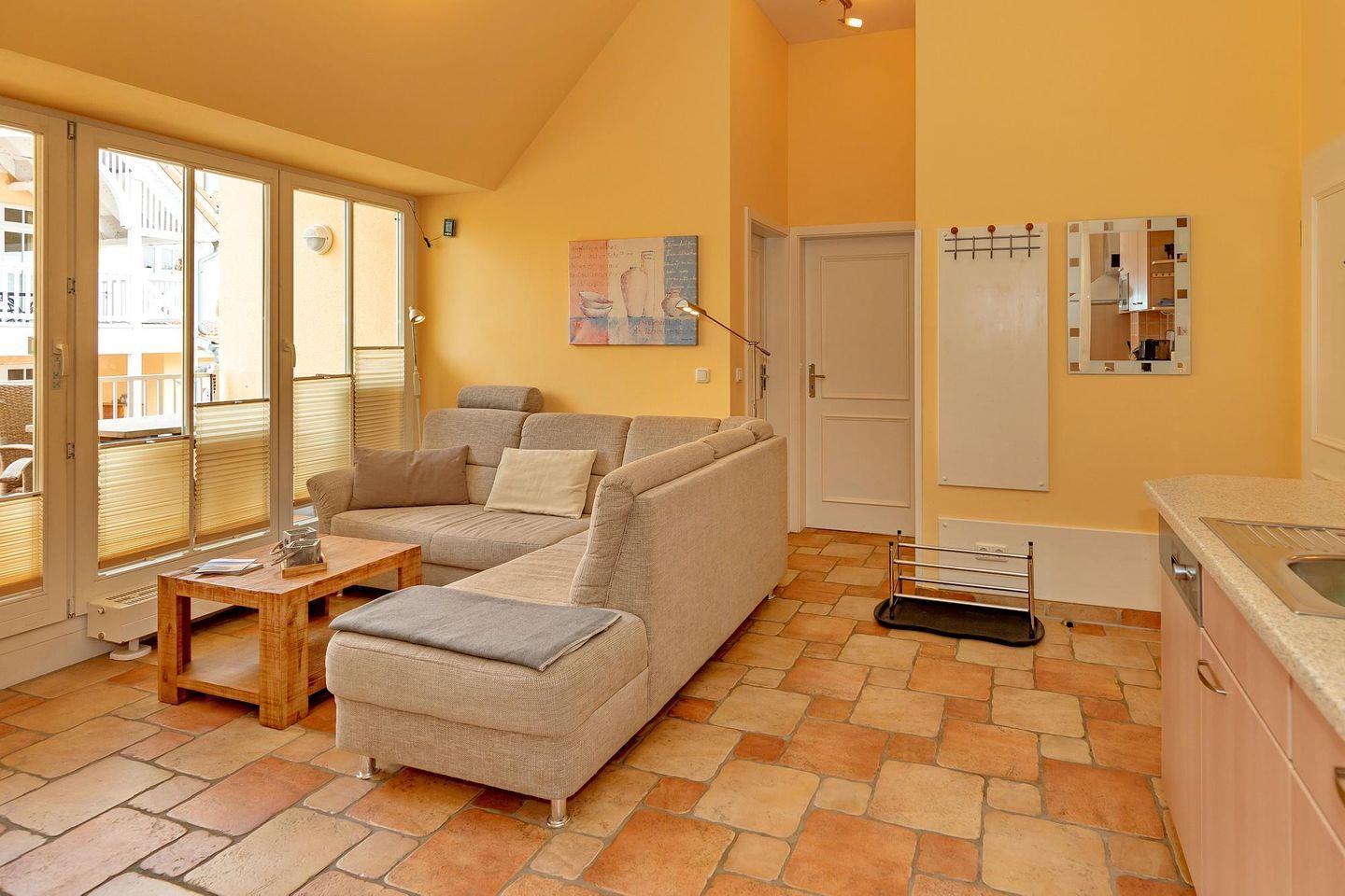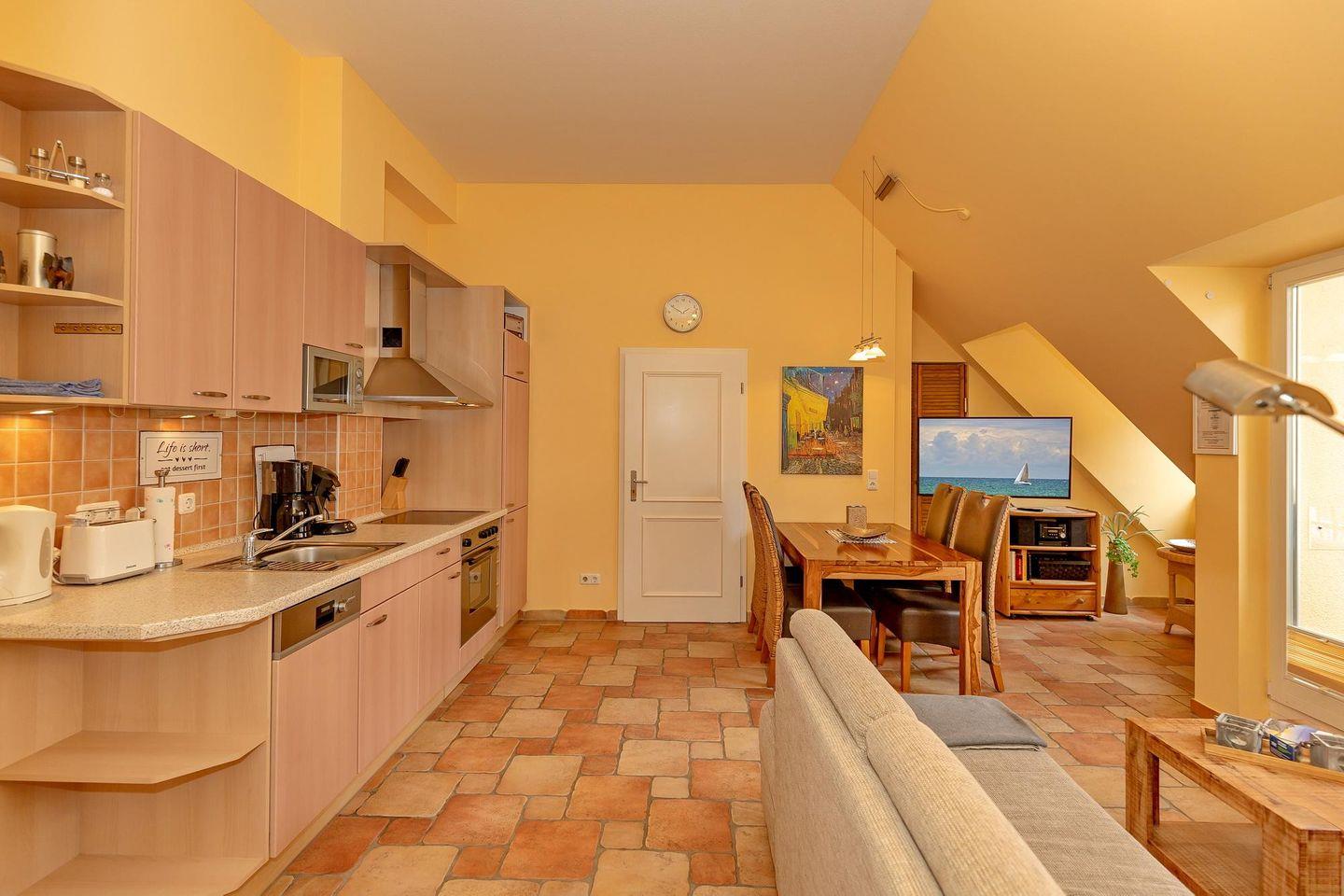 Im Dachgeschoss der Ferienanlage gelegen befindet sich das Apartment zwischen Ostseestrand und Stadtwald, auf der Nordseite des Hauses 2.