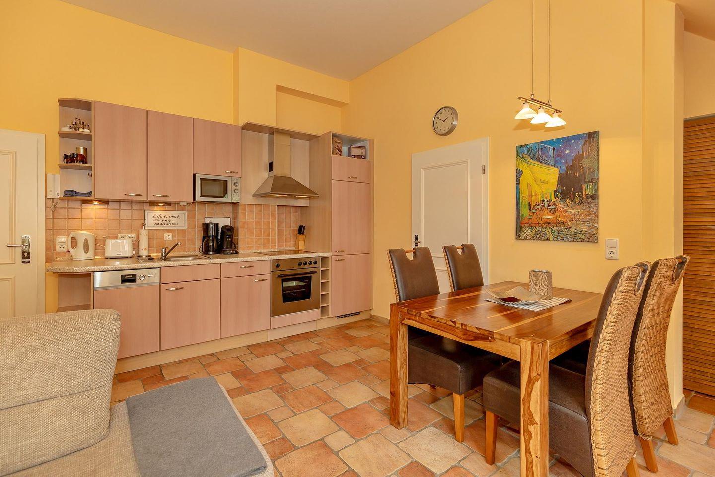 Zur Ferienanlage gehört ein eigener Wellnessbereich mit Pool, zwei Saunen, Fitness- und Ruheraum, der euch täglich zur Verfügung steht (lediglich in der 3. und 4. Kalenderwoche eines Jahres ist der Bereich auf Grund von Wartungsarbeiten geschlossen). Außerdem steht euch ein kostenfreier PKW-Stellplatz zur Verfügung. Nutzt gerne Münzwaschmaschine und -trockner in der Anlage ebenso wie den Bademantelverleih im Servicebüro. In diesem Nichtraucher-Apartment ist euer Familienhund herzlich willkommen.