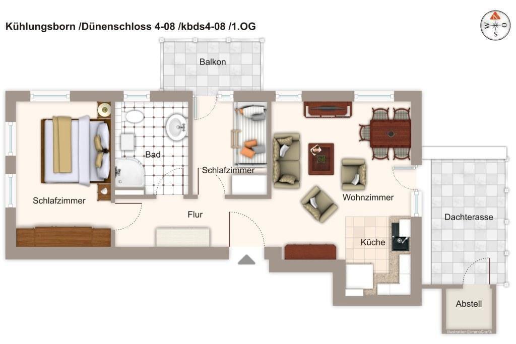 Die beliebte Ferienanlage Dünenschloss liegt an der Ostseeallee, eingebettet zwischen Ostseestrand und Stadtwald. Euer Ferienapartment befindet sich auf der Nordwestseite im ersten Obergeschoss von Haus 4.