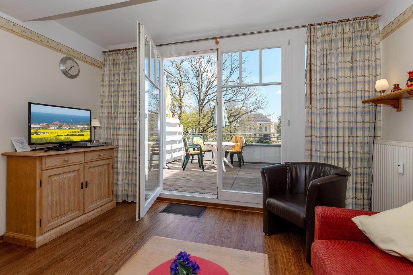 Das Apartment verfügt über kostenfreies WLAN und eine voll ausgestattete offene Küche mit Geschirrspüler, Cerankochfeld, Mikrowelle, Wasserkocher, Kaffeemaschine, Toaster und Tiefkühlfach. Der kombinierte Wohn- und Essbereich verfügt über eine TV-HiFi-Anlage mit Flachbild-TV, DVD-Player und eine Doppelschlafcouch. Sowohl der Esstisch, als auch der behagliche Sitzbereich bieten genügend Platz, um schöne Stunden beim Frühstück oder nach einem ereignisreichen Tag am Strand zu verbringen. Überdies verfügt die Ferienwohnung über ein Bügeleisen, ein Bügelbrett und einen Föhn. Das separate Schlafzimmer ist ausgestattet mit einem großen Doppelbett (2 x 0,90 x 2,00). Das Schlafzimmerfenster liegt zum Atrium, dem begrünten, überdachten Innenhof des Gebäudes. Vom großen und möblierten Balkon habt ihr einen wunderbaren seitlichen Blick auf die Ostsee. Der Balkon ist vom Wohn-/ Essbereich zugänglich.
