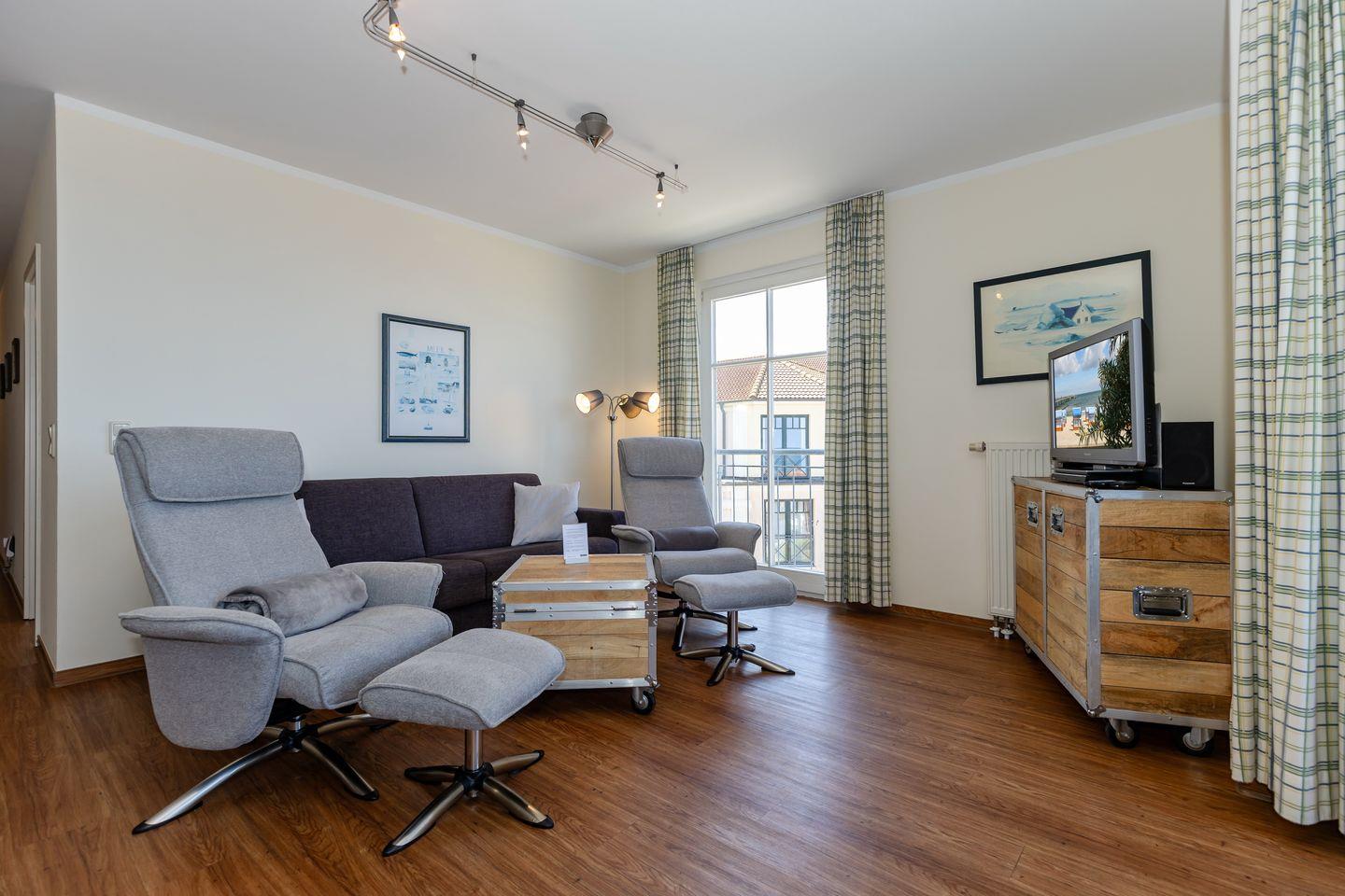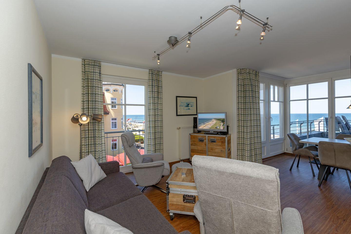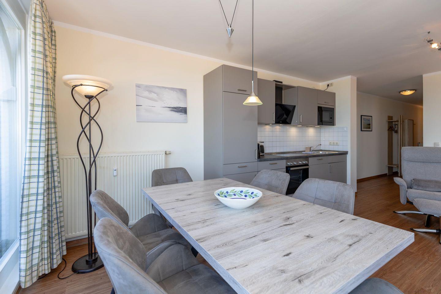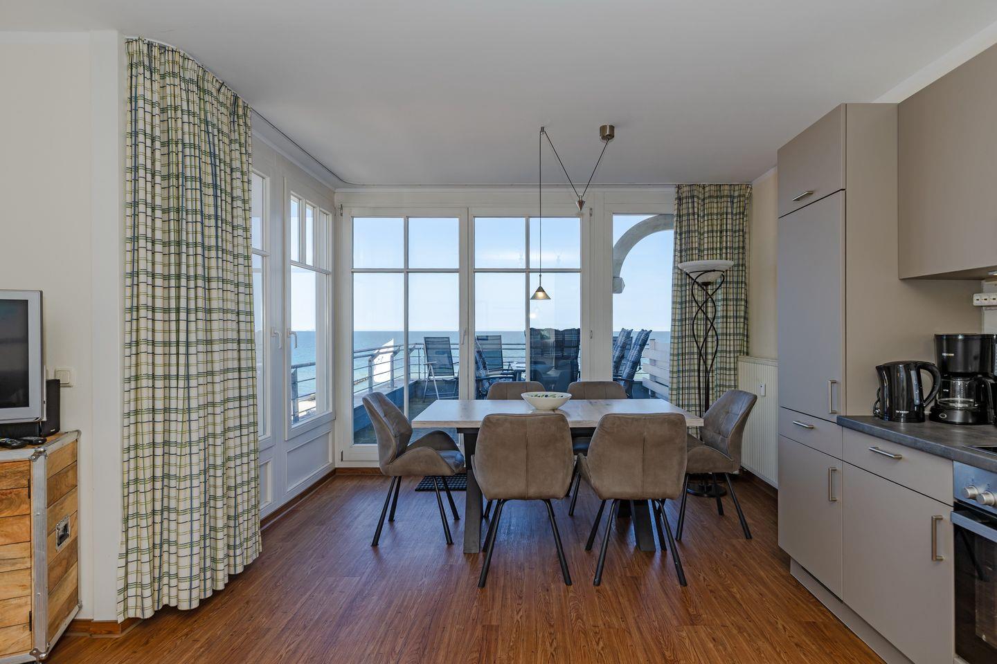 Das 70 m² große 3-Zimmer-Apartment ist für bis zu 6 Personen geeignet. Besonders hervorzuheben ist die direkte Strandlage der Apartmentanlage und der großzügige nach Norden gelegene Balkon mit Blick auf die Ostsee.
