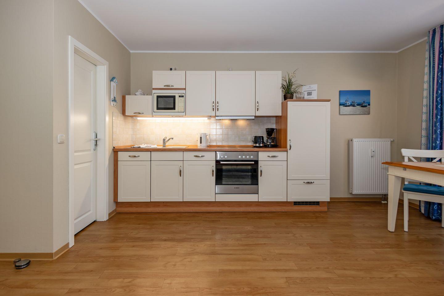 Das hochwertige Interieur der Ferienwohnung zeigt sich in einer voll ausgestatteten offenen Küche mit Backofen, Mikrowelle und Geschirrspüler. Auch Bügeleisen und Bügelbrett stehen euch zur Verfügung ebenso wie ein Fernseher und eine HiFi-Anlage. Dusche und WC sind separiert vom Bad, das euch auch einen Föhn bereitstellt. Vom westlich gelegenen Balkon aus genießt ihr einen seitliche Meerblick auf die nahe Ostsee.