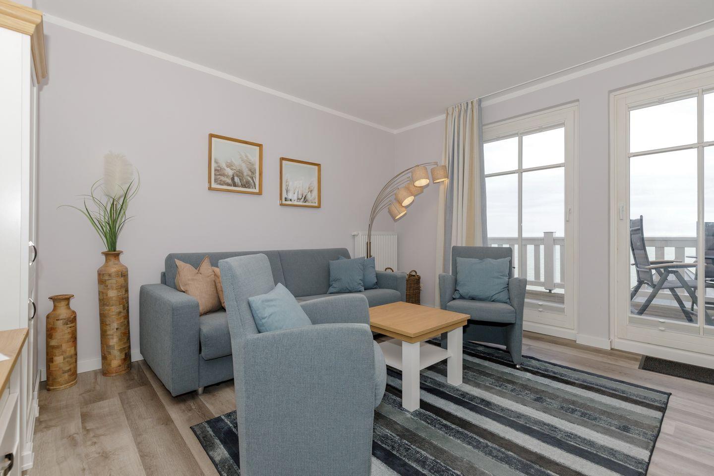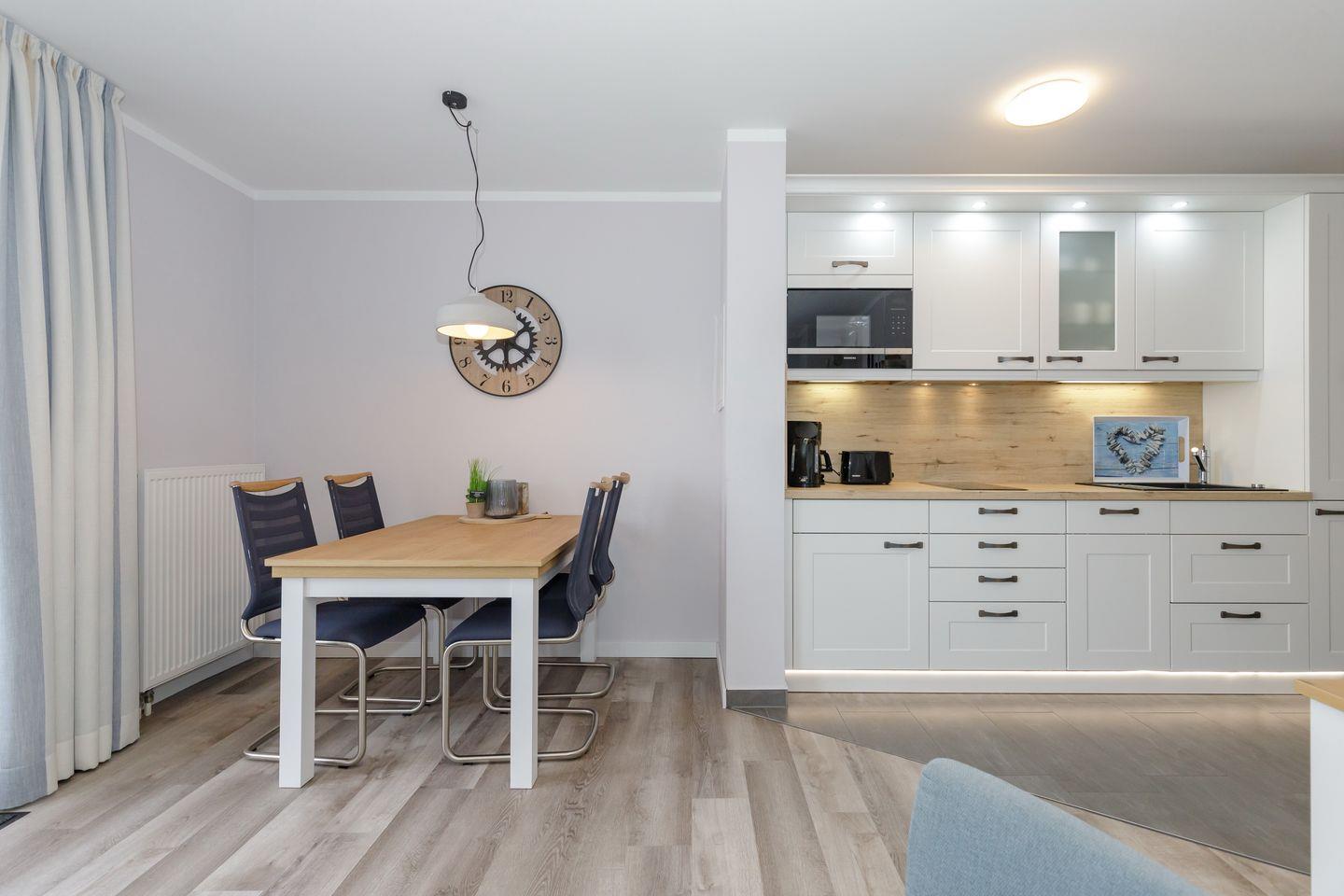 Das gemütliche Nichtraucher-Apartment verfügt über kostenfreies WLAN und eine voll ausgestattete offene Küche mit Geschirrspüler, Mikrowelle, Wasserkocher, Kaffeemaschine, Toaster und Tiefkühlfach. Der kombinierte Wohn- und Essbereich verfügt über eine TV-HiFi-Anlage mit Flachbild-TV, DVD-Player und eine Doppelschlafcouch. Sowohl der Esstisch, als auch der behagliche Sitzbereich bieten genügend Platz, um schöne Stunden beim Frühstück oder nach einem ereignisreichen Tag am Strand zu verbringen. Das separate Schlafzimmer verfügt über ein großes Doppelbett (2 x 0,90 x 2,00). Das Schlafzimmerfenster liegt zum Atrium, dem begrünten, überdachten Innenhof des Gebäudes. Vom großen und möblierten Balkon aus habt ihr einen wunderschönen Blick auf die nahegelegene Ostsee. Ein Kinderbett kann gegen Entgelt aufgestellt werden und auf Wunsch könnt ihr einen Hochstuhl hinzubuchen.