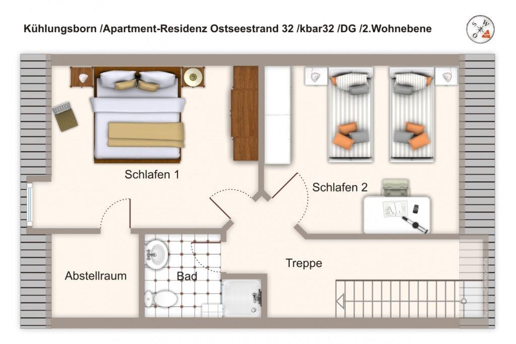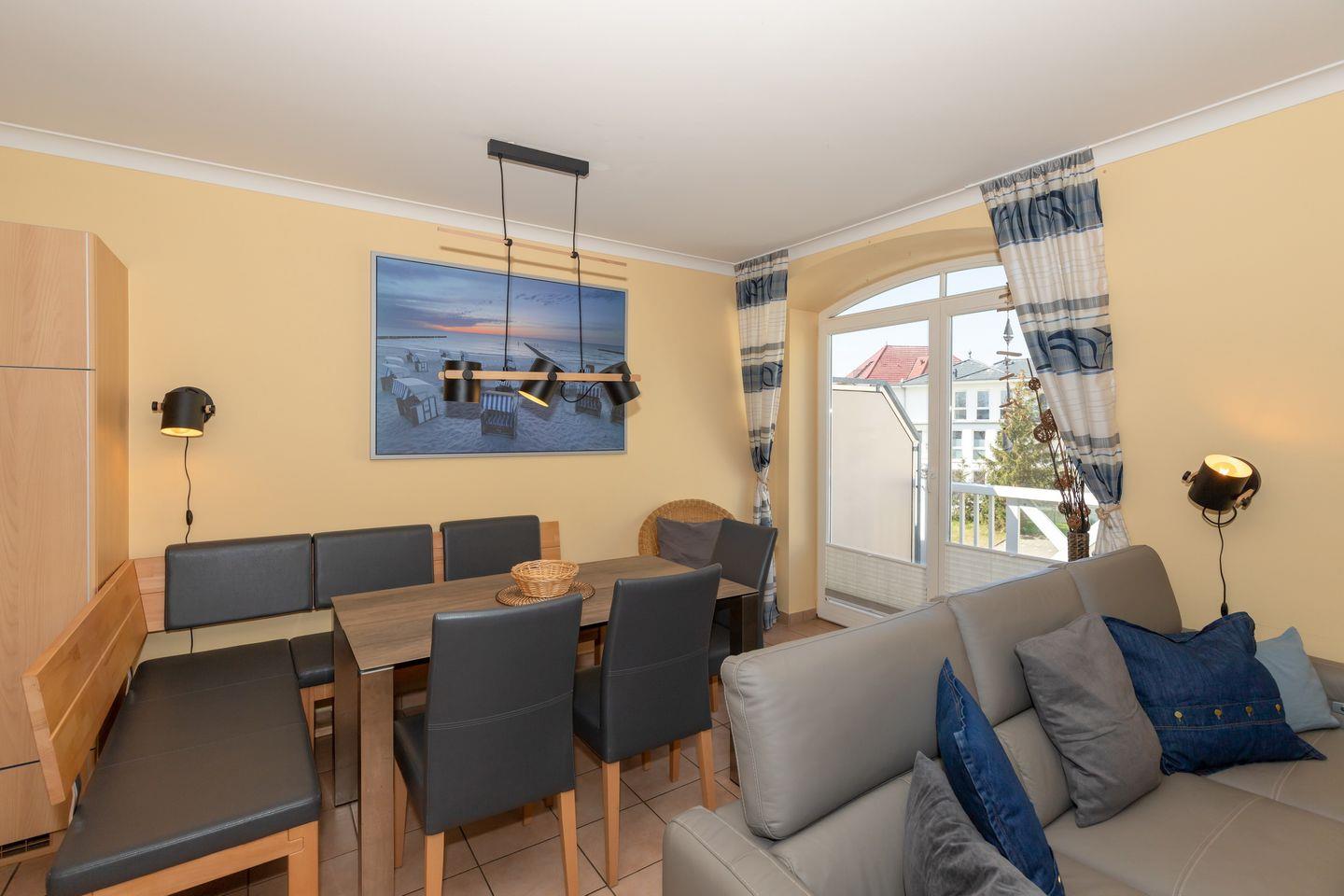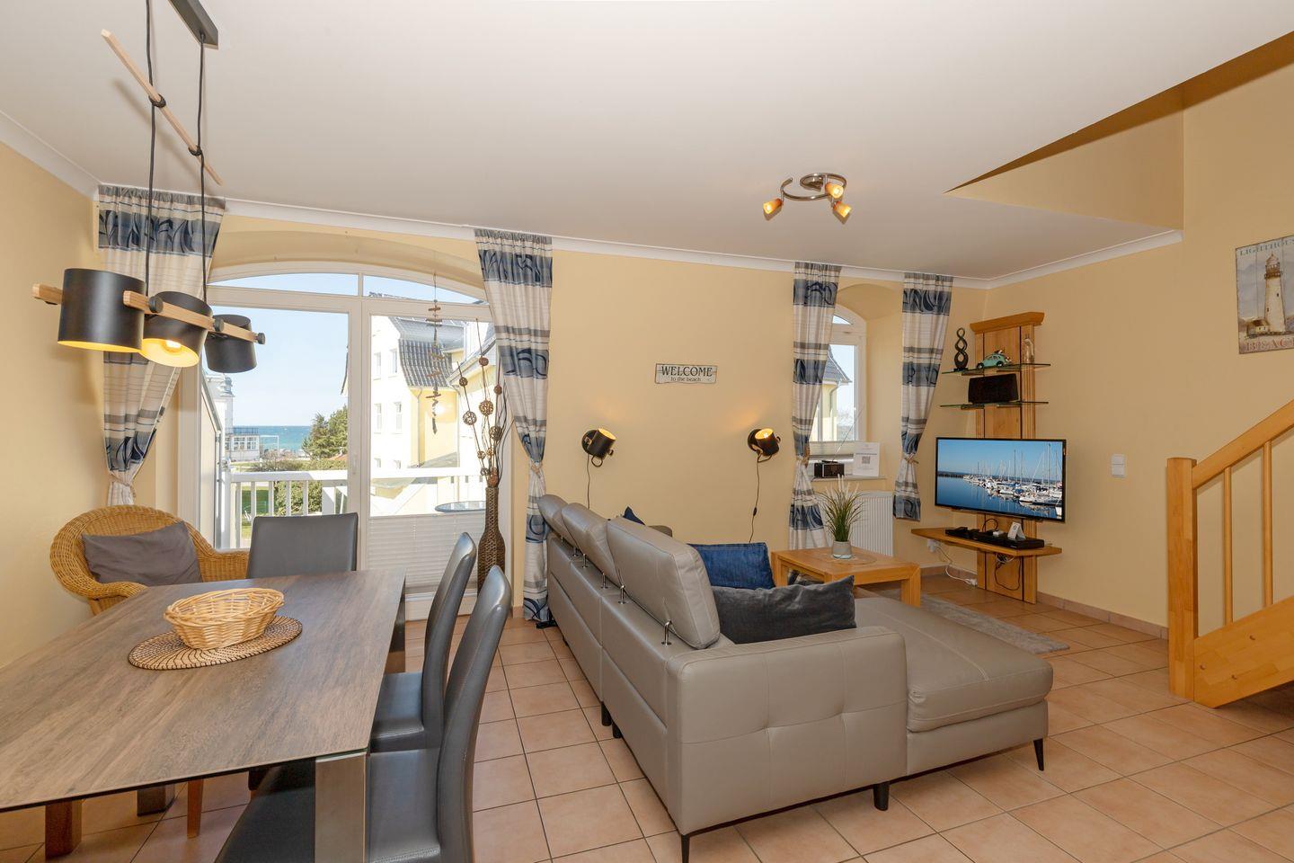 Die 66 m² große 3-Zimmer Maisonette-Wohnung über zwei Ebenen bietet Platz für bis zu 4 Personen. Besonders hervorzuheben ist die Lage der Apartmentanlage in direkter Nähe zum weißen Ostseestrand und der Balkon, von dem ihr teilweise auf die nahegelegene Ostsee blicken könnt.