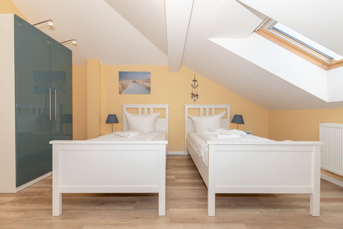 Das gemütliche Nichtraucher-Apartment verfügt über WLAN und eine voll ausgestattete offene Küche mit einem Backofen, einem Toaster, einer Kaffeemaschine, einer Mikrowelle, einem Wasserkocher und einer Geschirrspülmaschine. Im kombinierten Wohn- und Essbereich stehen euch eine HiFi-Anlage, ein Flachbild-TV und ein DVD-Player zur Verfügung. Sowohl der Esstisch, als auch der behagliche Sitzbereich bieten genügend Platz, um schöne Stunden beim Frühstück oder nach einem ereignisreichen Tag am Strand zu verbringen. Die Wohnung verfügt über zwei separate Schlafzimmer, eines ausgestattet mit einem großen Doppelbett (2 x 0,90 x 2,00), ein weiteres mit zwei Einzelbetten (2 x 0,90 x 2,00). Überdies befinden sich im Abstellraum zwei Zustellbetten. Ein Kinderbett kann gegen Entgelt aufgestellt werden und auf Wunsch könnt ihr gerne einen Hochstuhl hinzubuchen. Vom nach Norden gelegenen Balkon habt ihr teilweise Meerblick auf die nahegelegene Ostsee.