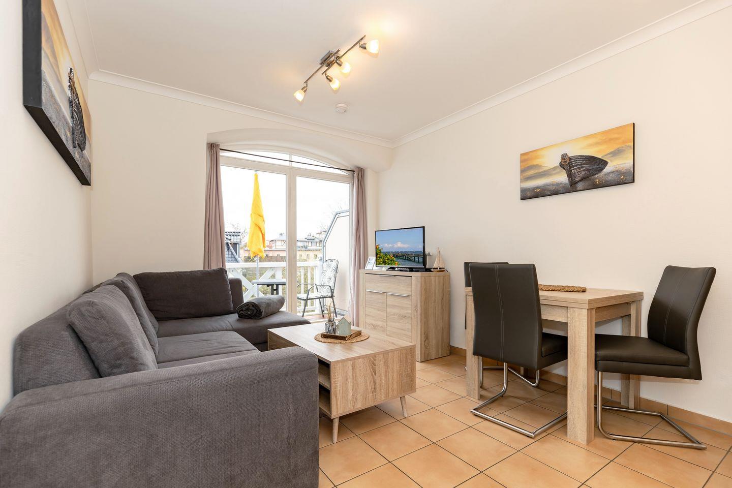 Das 37 m² große 2-Zimmer-Apartment mit Balkon bietet Platz für bis zu 4 Personen. Besonders hervorzuheben ist die Lage der Apartmentanlage in direkter Nähe zum weißen Ostseestrand.
