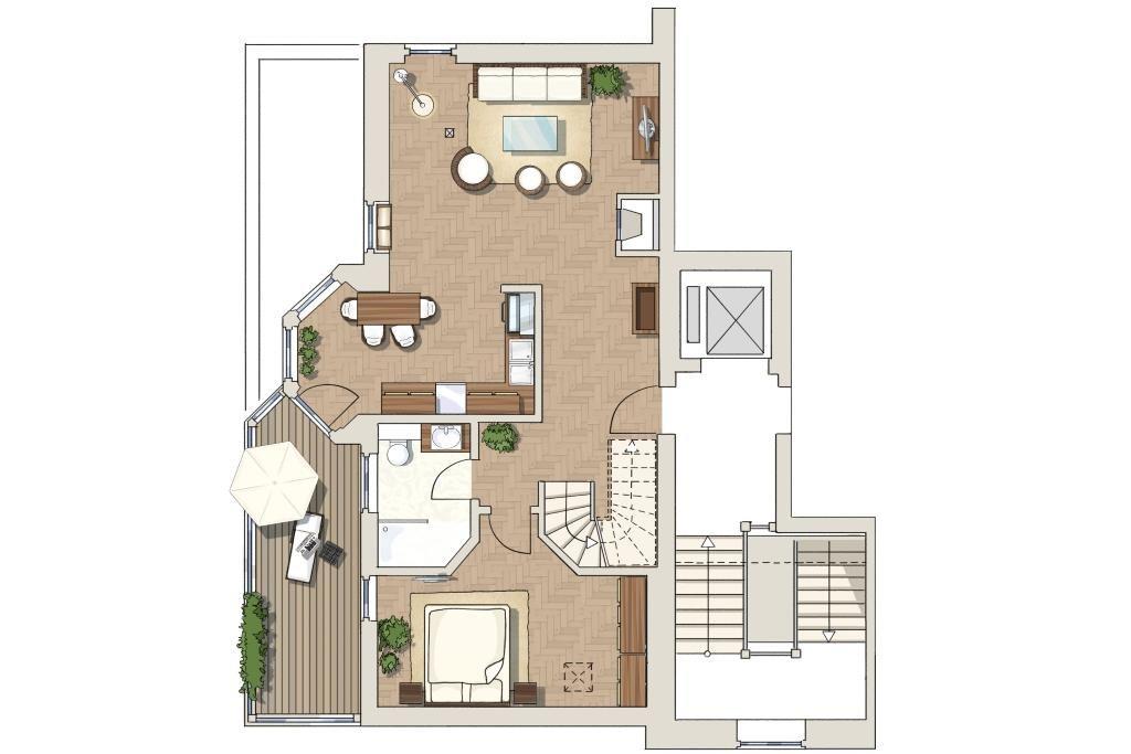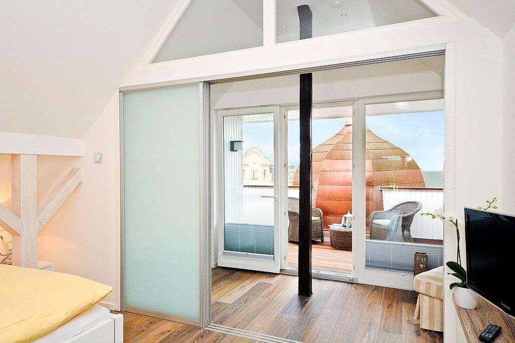 Die 105 m² große 3-Zimmer-Residenz Kriemhild ist für bis zu 4 Personen geeignet. Es handelt sich hier um eine Maisonette-Wohnung, deren verschiedene Ebenen durch eine Treppe miteinander verbunden sind und die über einen traumhaften Meerblick verfügt. Besonders hervorzuheben sind die drei Balkone und die zwei Bäder des Apartments.
