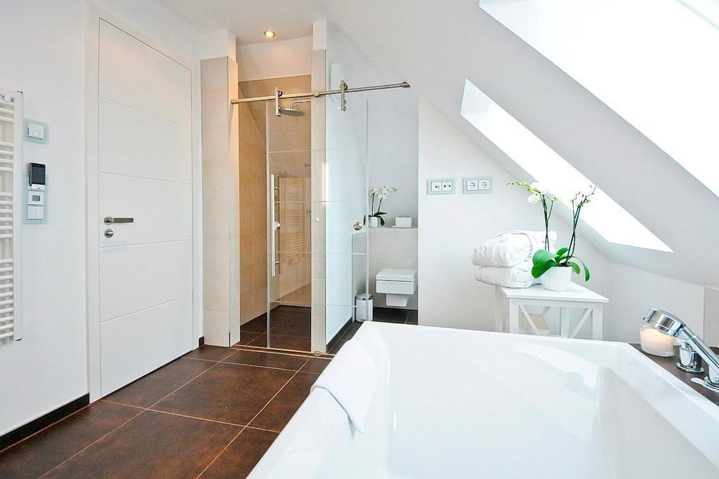 Genießt den Komfort von zwei Badezimmern mit jeweils einer großen, begehbaren Dusche sowie Waschtisch mit Föhn und Kosmetikspiegel. Eine große Badewanne lädt zum Entspannen ein.