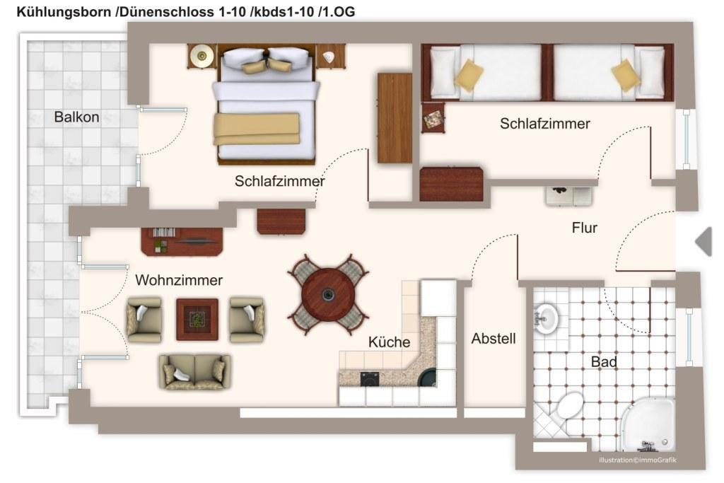 Das „Dünenschloss“ im Ostseebad Kühlungsborn verfügt über familienfreundliche Ferienwohnungen. Auf einer Wohnfläche von 57qm bietet das komfortable 3-Zimmer-Apartment Platz für 4 Personen. Vom Balkon aus blickt ihr zum Hof der Ferienanlage.