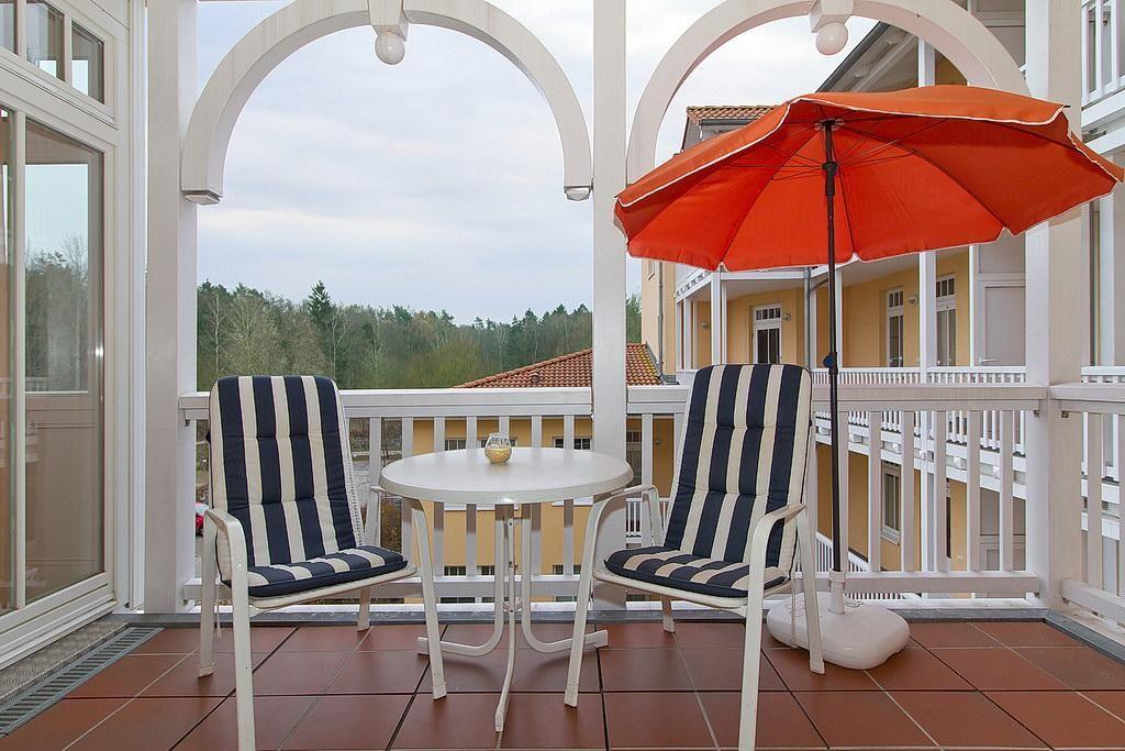 Das südlich gelegene Apartment befindet sich im 2. Obergeschoss im Haus 1, Aufgang A, mit seitlichem Blick zum Stadtwald in Kühlungsborn und zum Hof der Anlage.