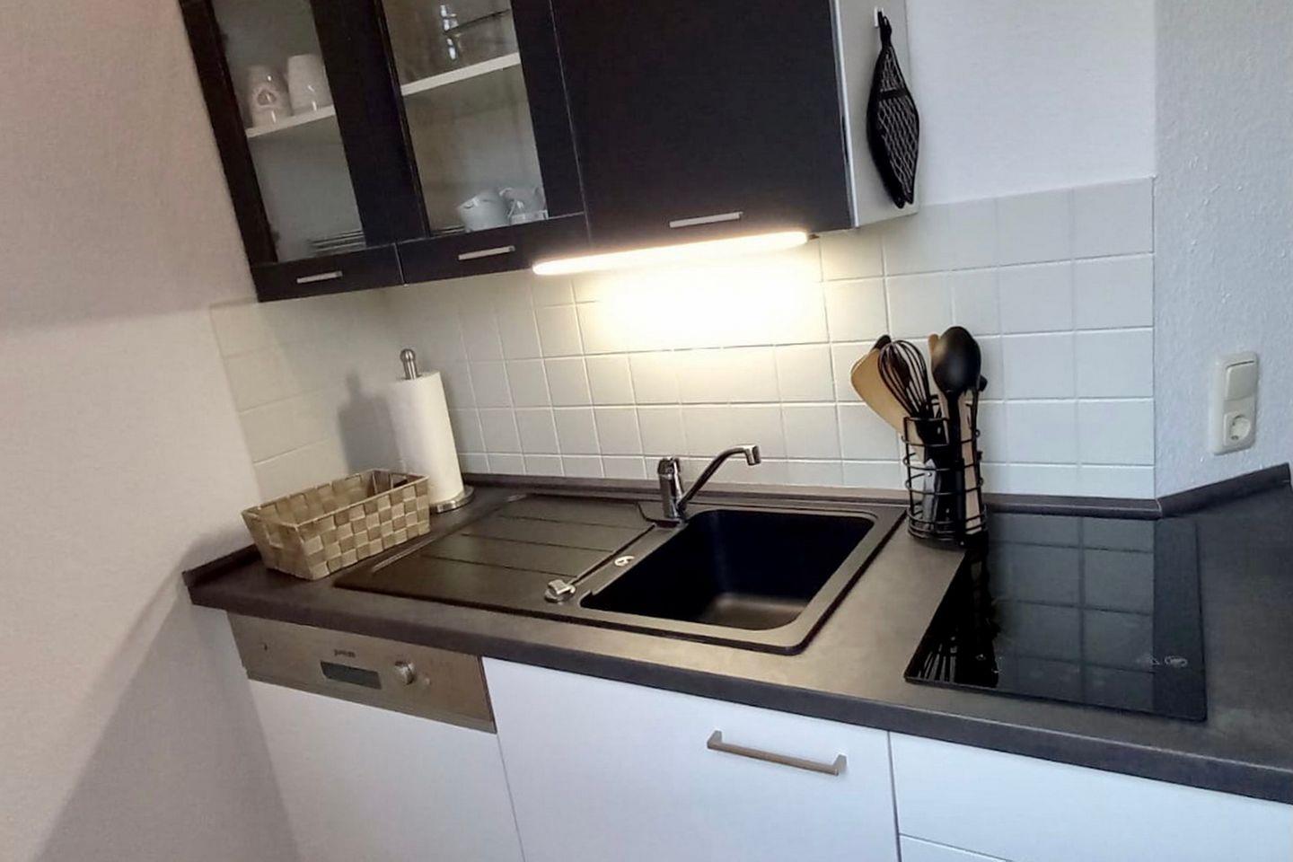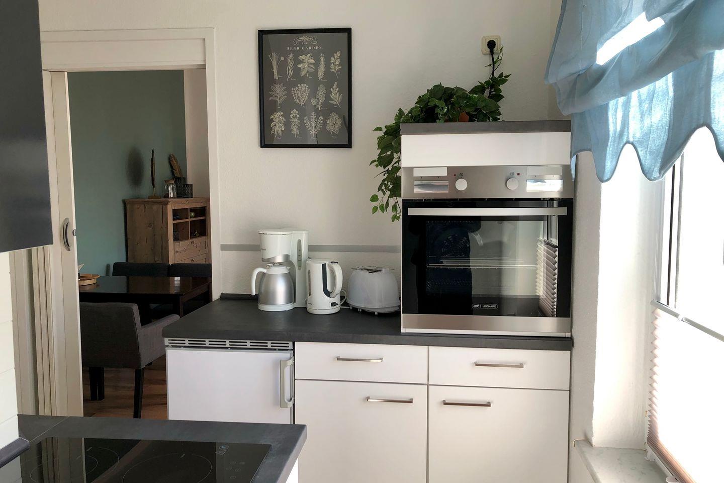 Der Küchenbereich der Ferienwohnung ist für dich mit einem Kühlschrank mit Gefrierfach, einem Backofen, einem 2-Platten-Kochfeld und einem Geschirrspüler ausgestattet. Ein Wasserkocher, eine Kaffeemaschine und ein Toaster vervollständigen die Kücheneinrichtung.