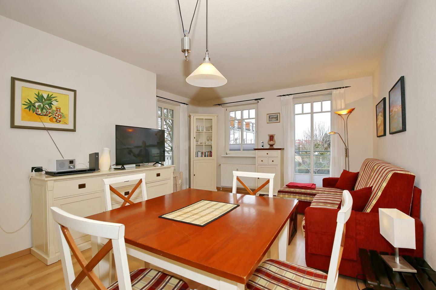 Ebenfalls im Raum integriert ist die Küchenzeile. Diese bietet dir ein Induktionskochfeld (4 Platten-Kochfeld), einen Backofen mit integrierter Mikrowelle, einen kleinen Geschirrspüler sowie einen Kühlschrank mit Gefrierfach. Selbstverständlich findest du hier auch eine Kaffeemaschine, einen Wasserkocher und einen Toaster vor. Des Weiteren steht dir in der Küche noch eine Cafissimo-Kaffeemaschine mit Espressofunktion zur Verfügung. Im angrenzenden Essbereich kannst du deine gemeinsamen Mahlzeiten genießen.
