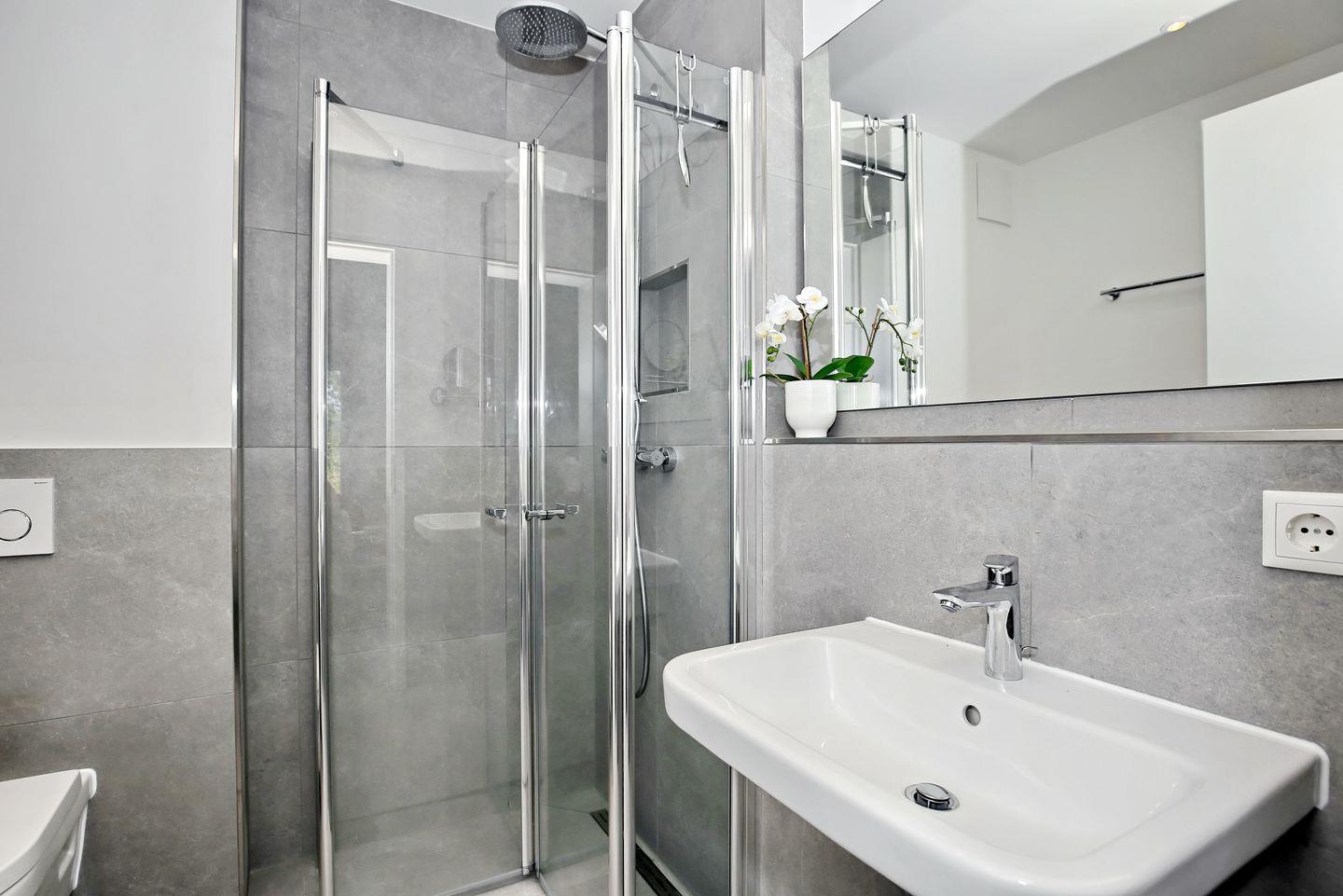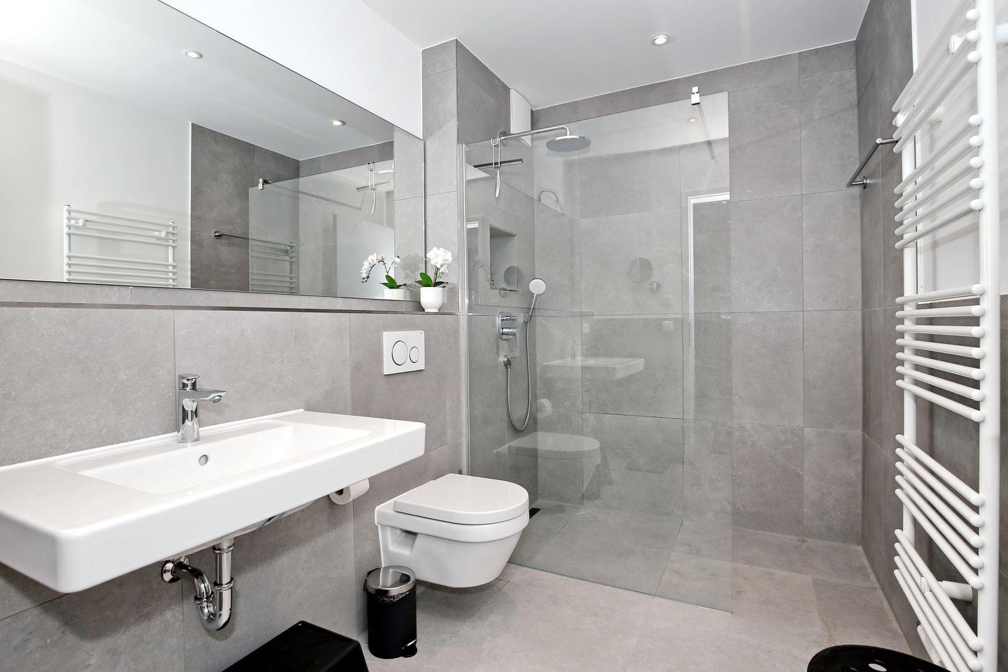 Die beiden Bäder sind modern gestaltet und verfügen jeweils über eine ebenerdige Dusche, ein WC, beleuchtete Spiegel und Kosmetikspiegel sowie einen Föhn. In einem der Bäder befindet sich ein Kombinationsgerät aus Waschmaschine und Trockner. Die Sauna ist in den Flur integriert und wird durch Münzeinwurf (30 Minuten kosten 1,00 €) betrieben.