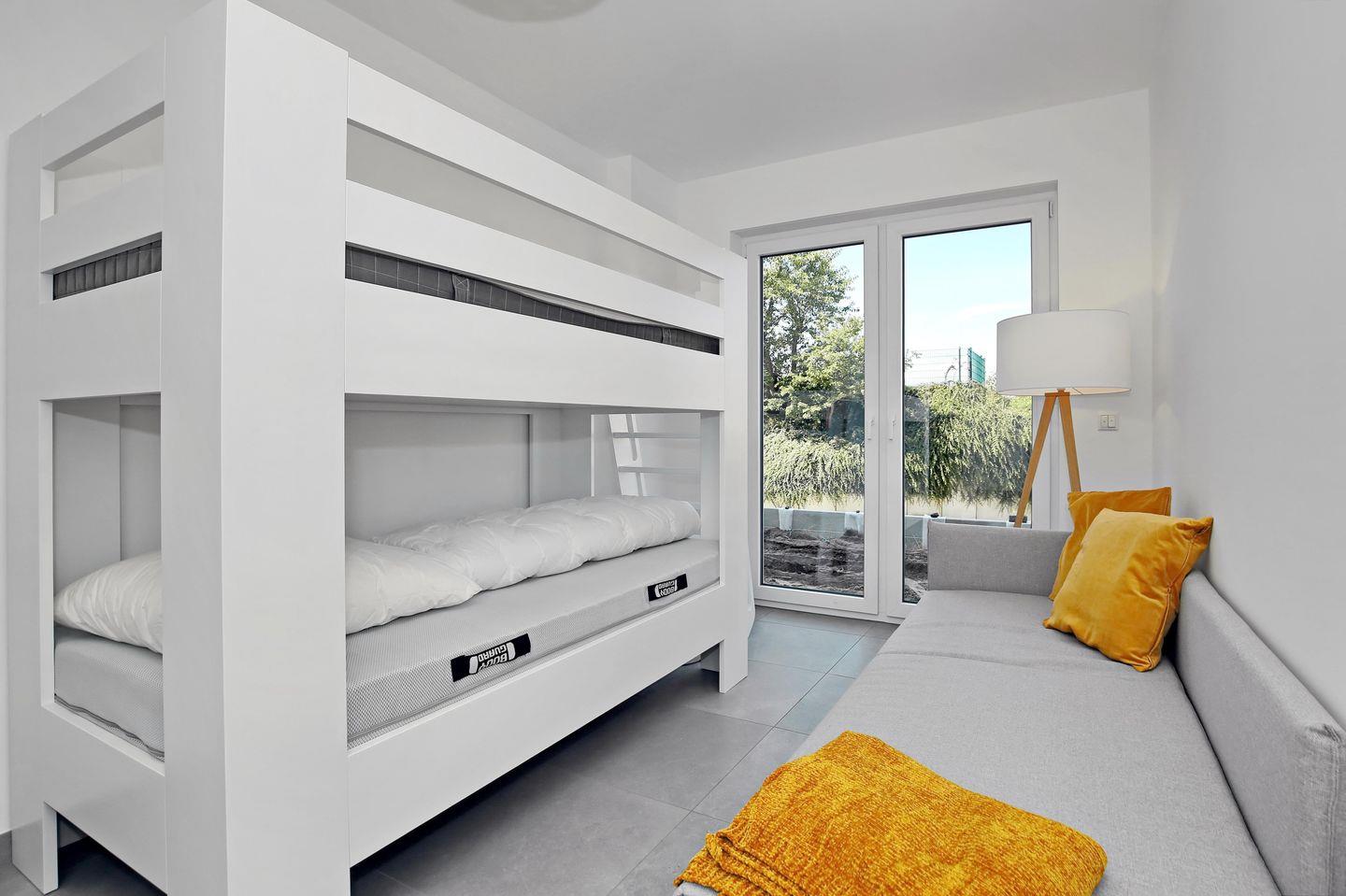 Im ersten Schlafzimmer der Ferienwohnung empfängt dich ein bequemes Vollholz-Doppelbett der Marke Team7 (180 x 200 cm) zur erholsamen Nachtruhe. Für besonderen Komfort haben die Matratzen die Härtegrade H2 und H3. Ein Kleiderschrank bietet dir genügend Stauraum für dein Urlaubsgepäck. Ein Flachbild-TV sorgt für spätabendliche Unterhaltung. Das zweite Schlafzimmer ist ebenso mit einem Etagenbett mit Koje (2 x 100 cm x 200 cm), einem Kleiderschrank und einer Schlafcouch (80 x 200 cm) für eine weitere Person eingerichtet.