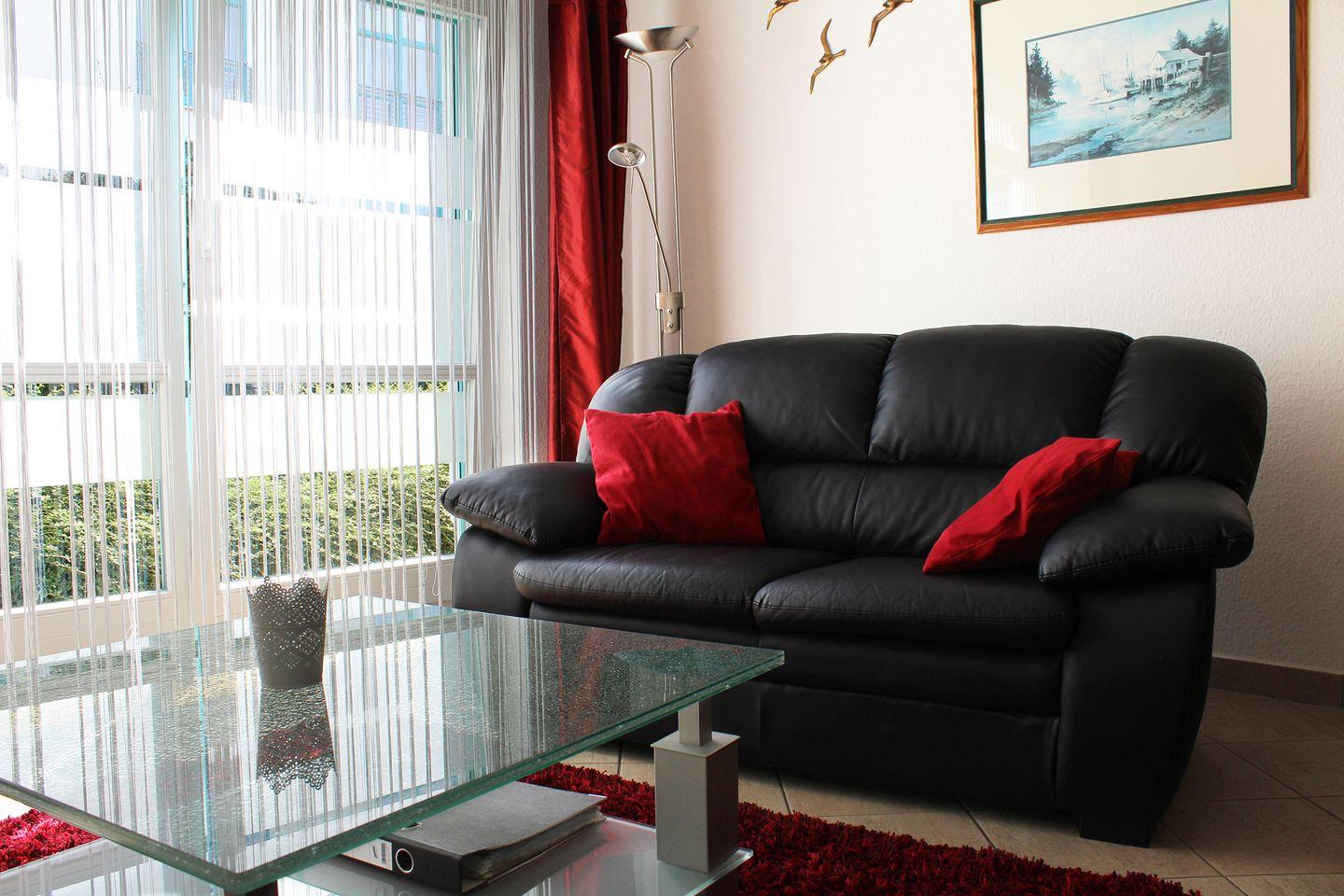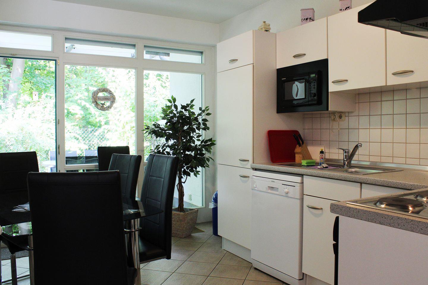 2 Zimmer, EG, 60 m², alle Fußböden sind gefliest, Küche mit E-Herd, Mikrowelle, Geschirrspüler und Essplatz, Bad mit Dusche und Waschmaschine, Farb-TV und DVD im Wohnzimmer, Doppelbett im Schlafzimmer, Wohnzimmer mit gemütlicher Sitzecke und 3 separaten Einzelschrankbetten. Safe vorhanden. kostenloses W-Lan. Terrasse, PKW - Tiefgaragenstellplatz, Fahrradabstellraum im Keller. Kinderspielplatz im Innenhof.