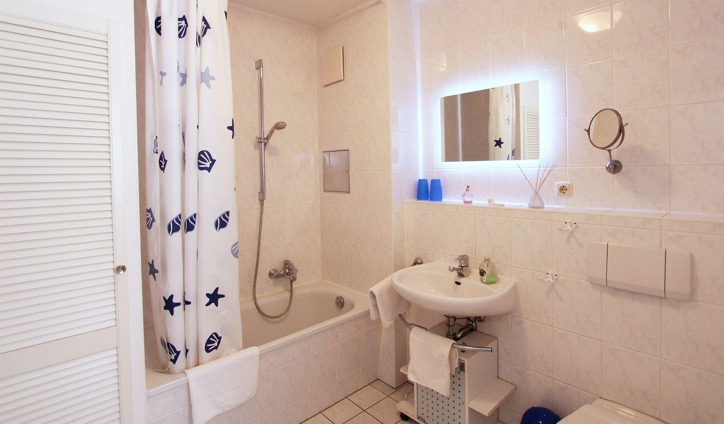 Das Bad hat eine kleine Badewanne mit Duschmöglichkeit. Haarfön und Bügeleisen müssen