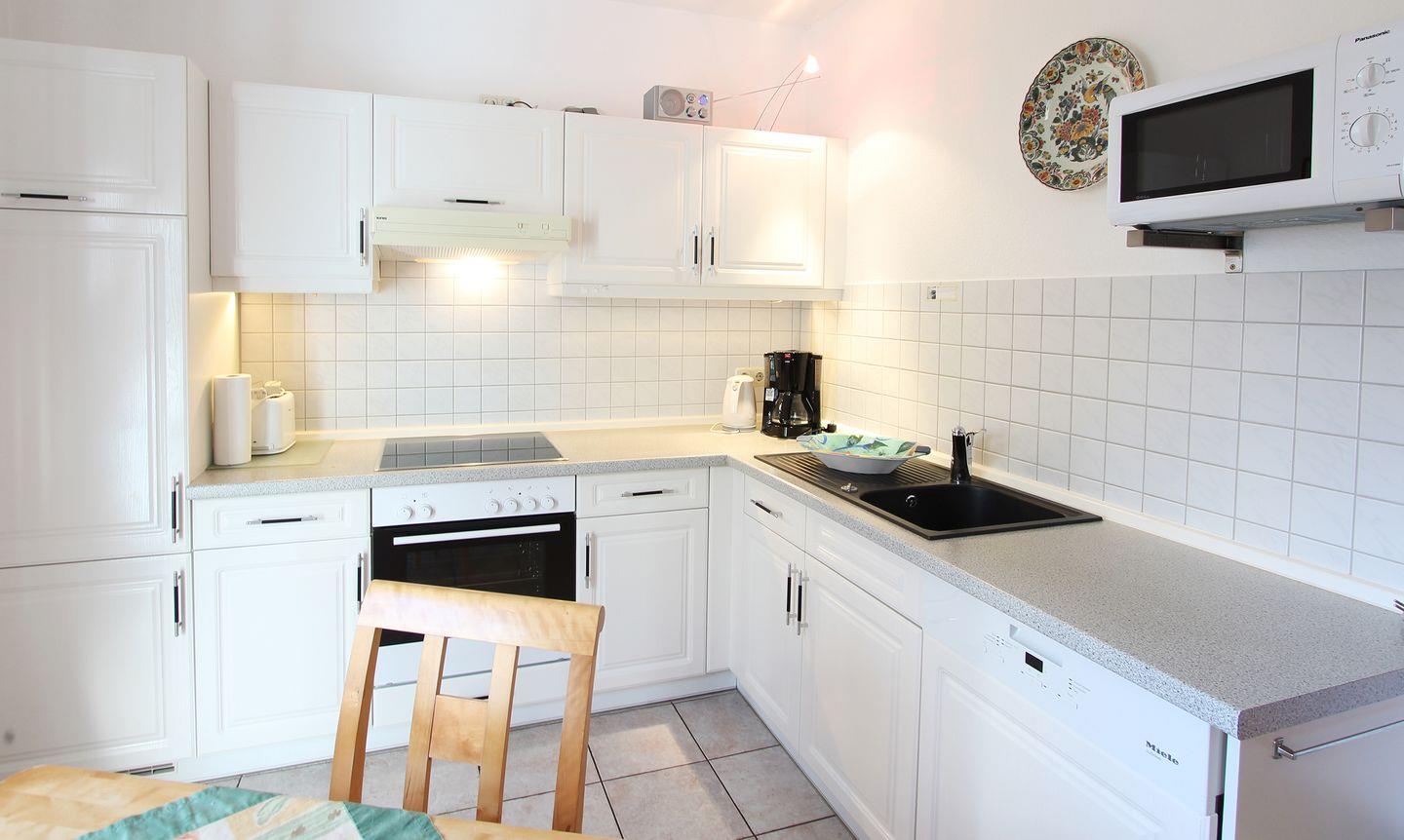 Die offene Küche ist zum Flur ausgerichtet und mit zahlreichen Annehmlichkeiten ausgestattet: Ihnen stehen Ceran-Herd, Backofen, Mikrowelle, Spülmaschine, Kühlschrank mit Gefrierfach, Wasserkocher, Kaffeemaschine sowie alle nötigen Küchenutensilien, Geschirr und Besteck zur Verfügung. Ein Esstisch im Essbereich schafft Platz für gemeinsame Mahlzeiten. Für Unterhaltung sorgen ein Kabel-TV (35–44 Zoll) und kostenfreies WLAN. Die Nichtraucherwohnung verfügt zudem über Garderobe, Wäscheständer und Staubsauger, was den Aufenthalt besonders komfortabel macht.