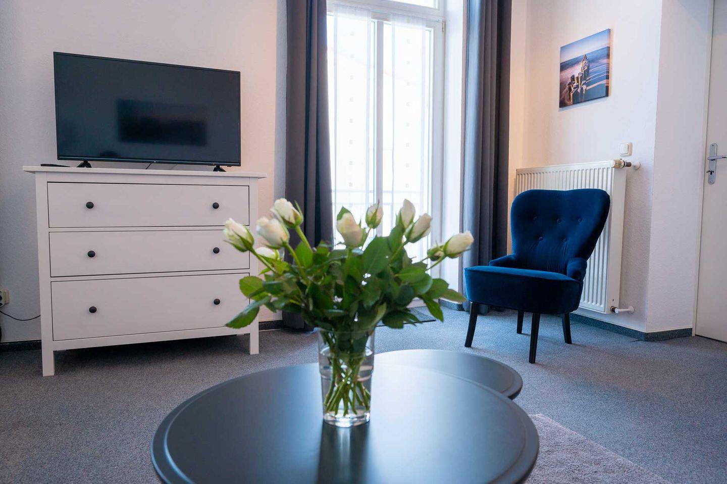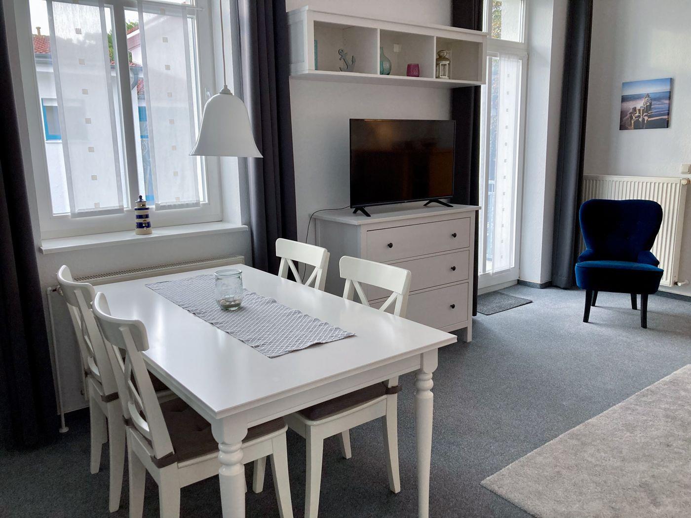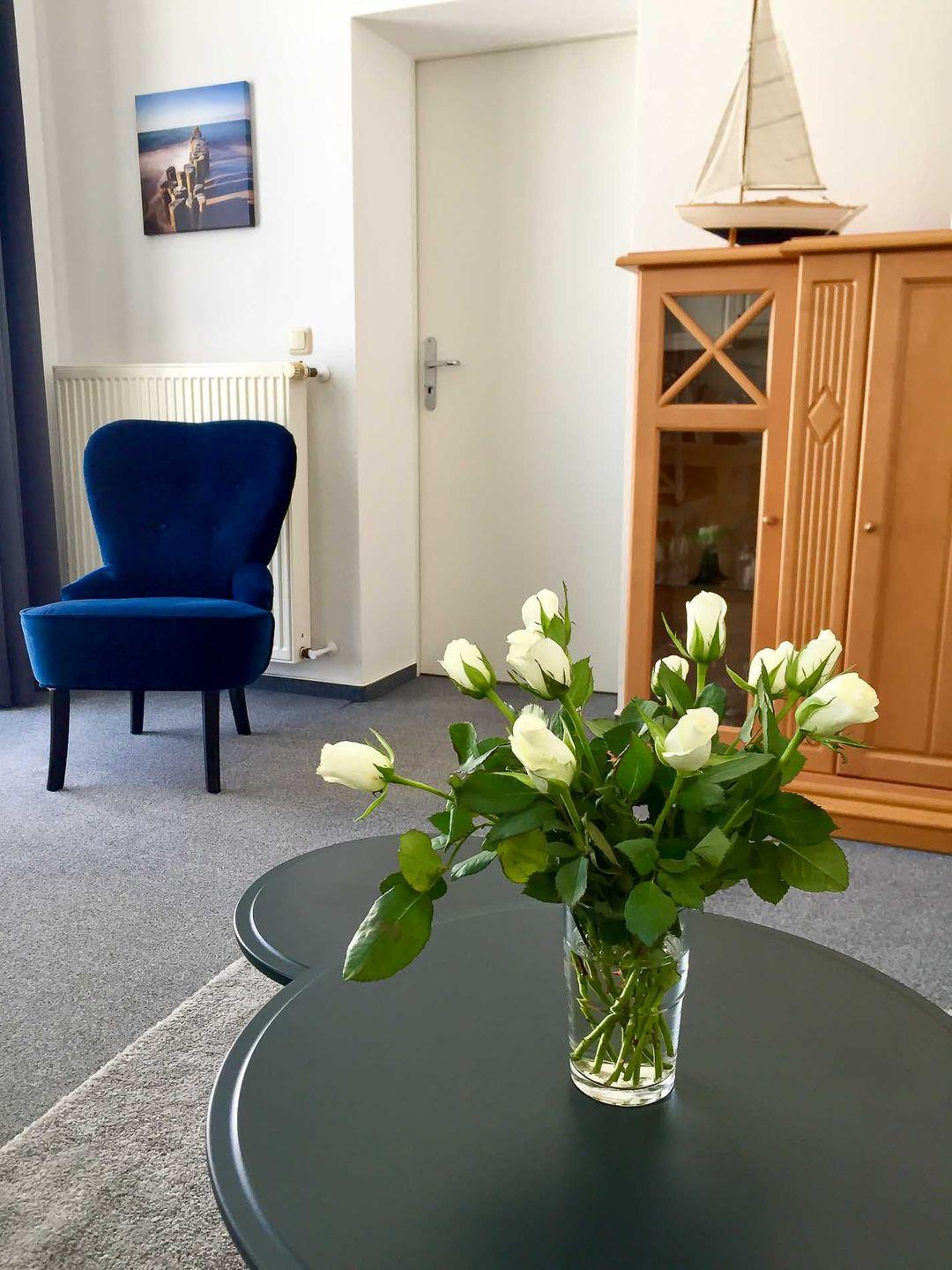Die 2-Zimmer-Ferienwohnung "Windlicht" liegt im 1. OG der Bäderstilvilla Sanssouci an der ruhigen, von der Strandstraße abgewandten Seite.