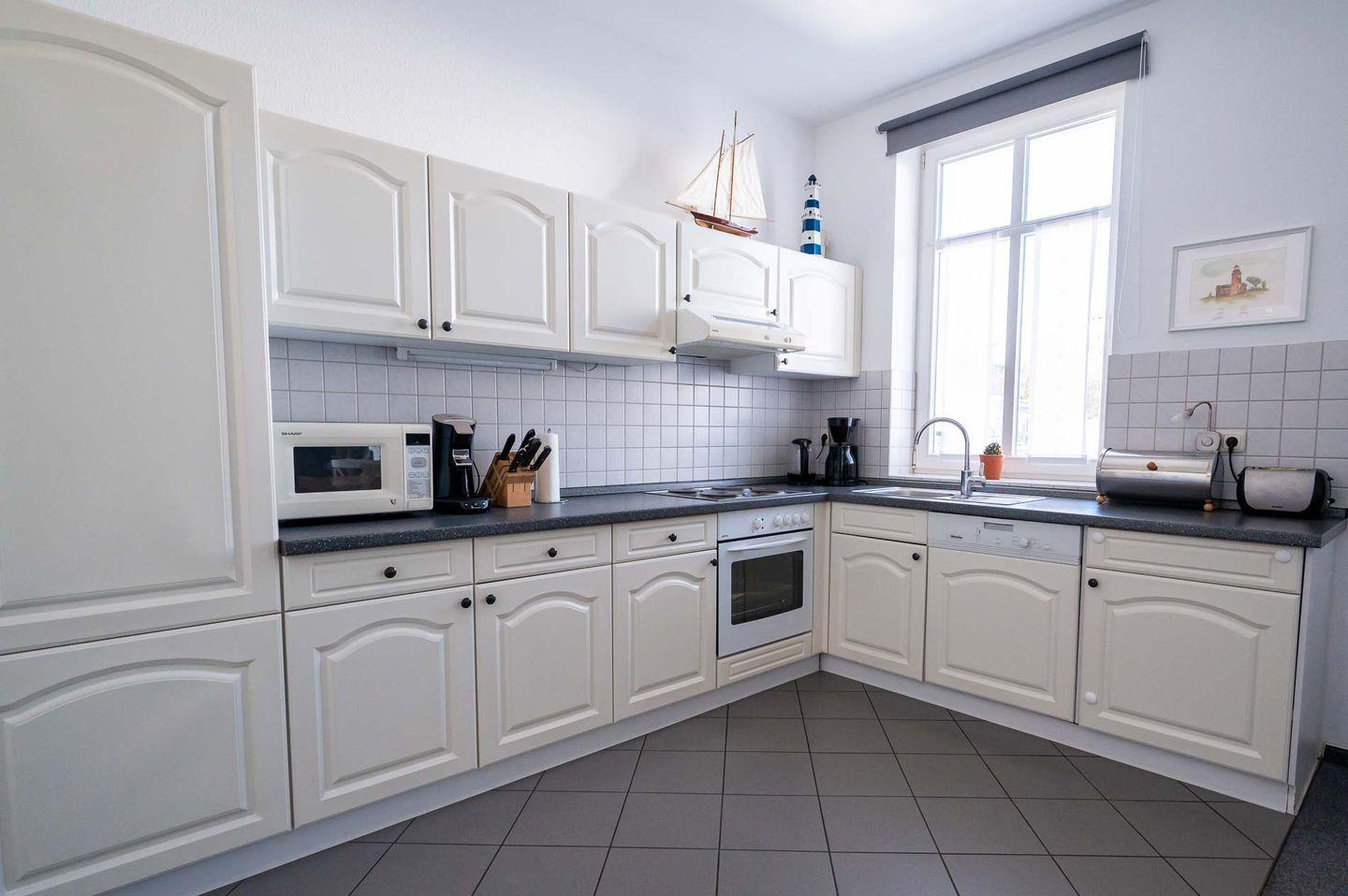 In der Küche sind Kühlschrank, Geschirrspüler, Mikrowelle und ein Herd mit Backofen vorhanden, außerdem eine Filter- und eine Senseo-Kaffeemaschine.