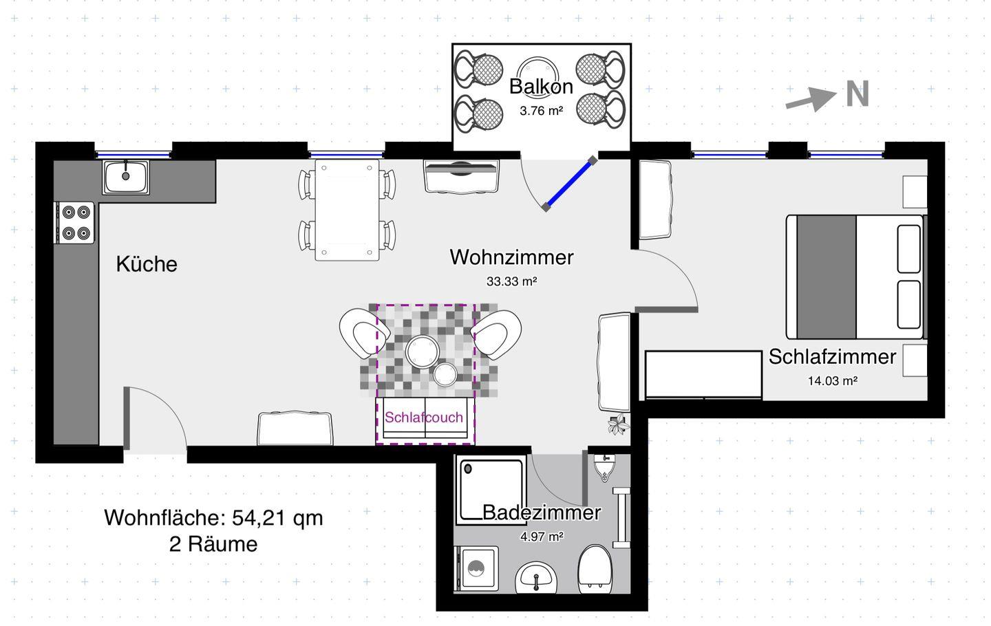 Sie verfügt über ein geräumiges Wohn-/ Esszimmer mit Balkon und großer Küchenzeile, einem Schlafzimmer und einem Bad mit Dusche und Waschmaschine.