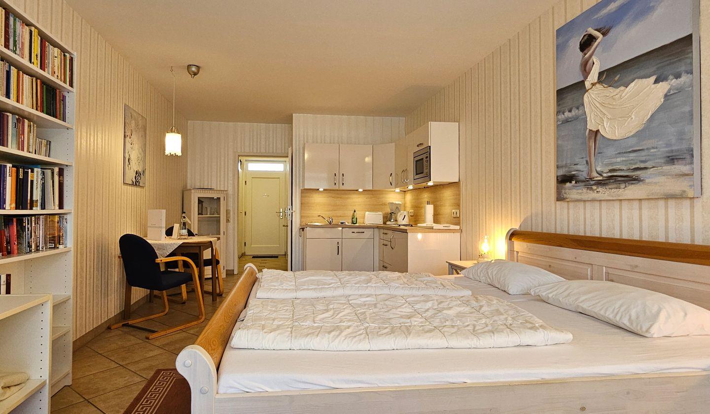 Die Ferienwohnung befindet sich in einem Neubau, in ruhiger Lage hinter der Villa Sanssouci. Die Wohnung ist im Erdgeschoss mit Terrasse, hat ein Wohn-/Schlafzimmer mit Küchenzeile und Duschbad. Die Villa Sanssouci liegt in der Haupteinkaufsstraße mit seinen vielen Geschäften und Restaurants, auch der nächste Bäcker für frische Brötchen und zum Frühstücken ist nicht weit entfernt. Zum schönen Strand und Seebrücke sind es ca. 200 m.