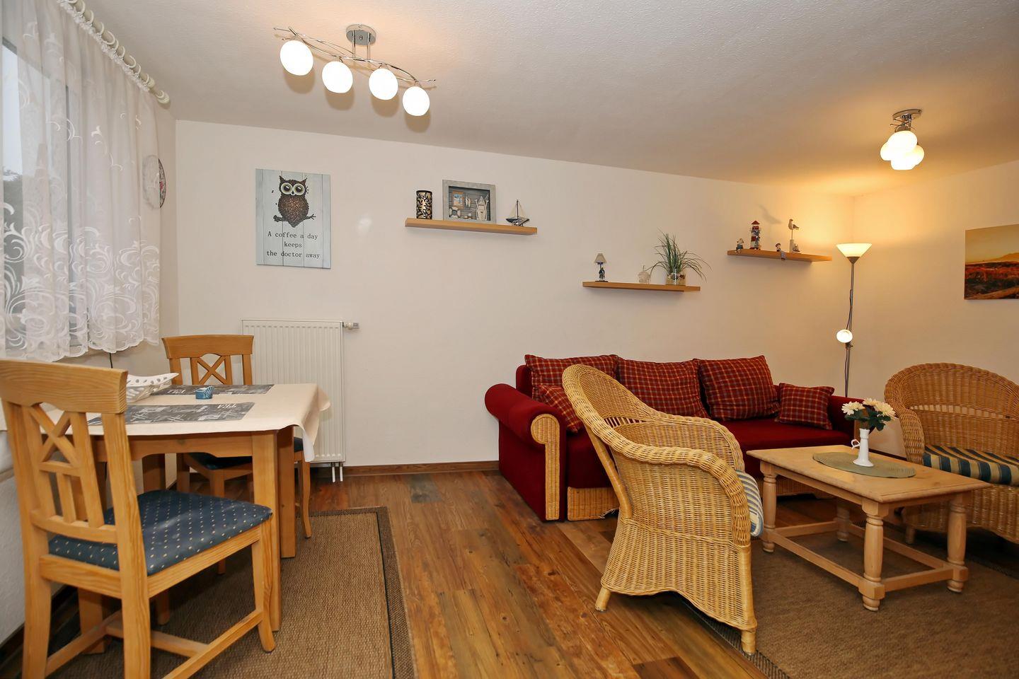 Der Wohnbereich der Ferienwohnung ist mit einem gemütlichen Sofa, zwei Korbsesseln, einer Kommode und einem Flachbild-TV eingerichtet. Der integrierte Essbereich bietet 2 Personen genügend Platz für gemeinsame Mahlzeiten.