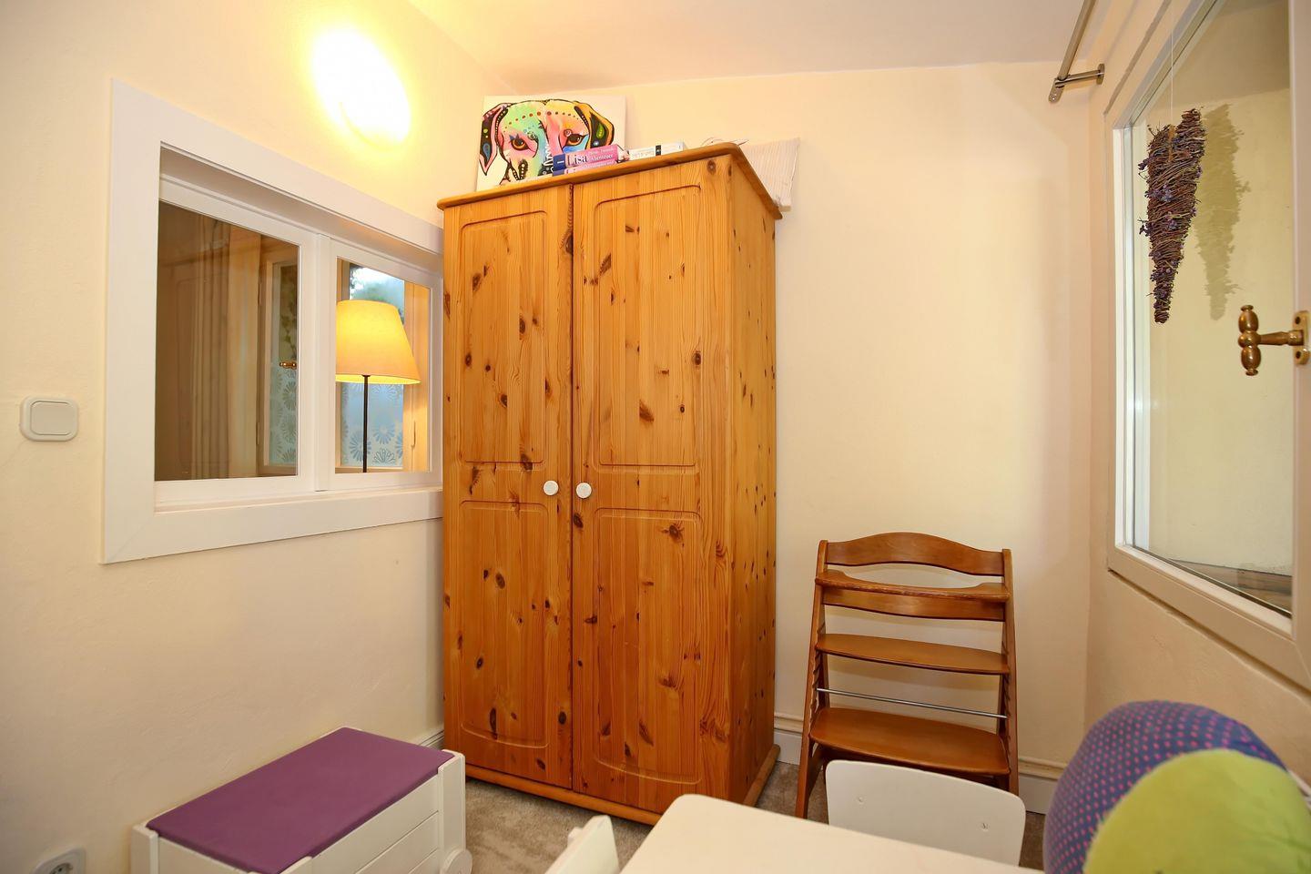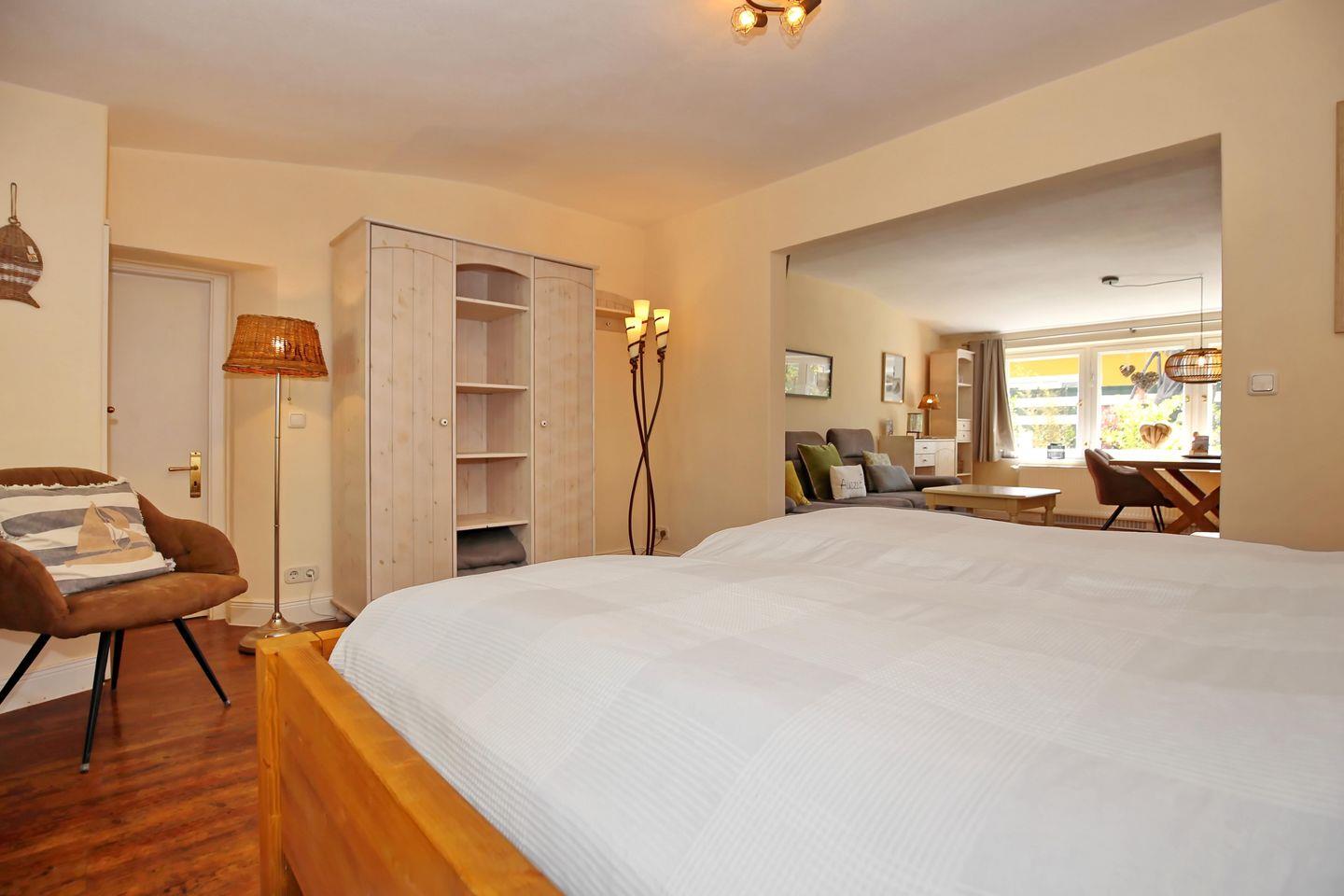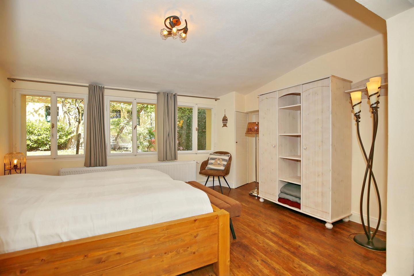 Entspannen kannst du auch in dem großzügig gehaltenen Schlafzimmer mit Doppelbett. In dem geräumigen Kleiderschrank kannst du alle Reiseutensilien bequem verstauen. Zur Verdunkelung und als Sichtschutz findest du in der gesamten Ferienwohnung Vorhänge an den Fenstern. Die großzügige Terrasse im Grünen lädt zu gemütlichen Grillabenden ein.