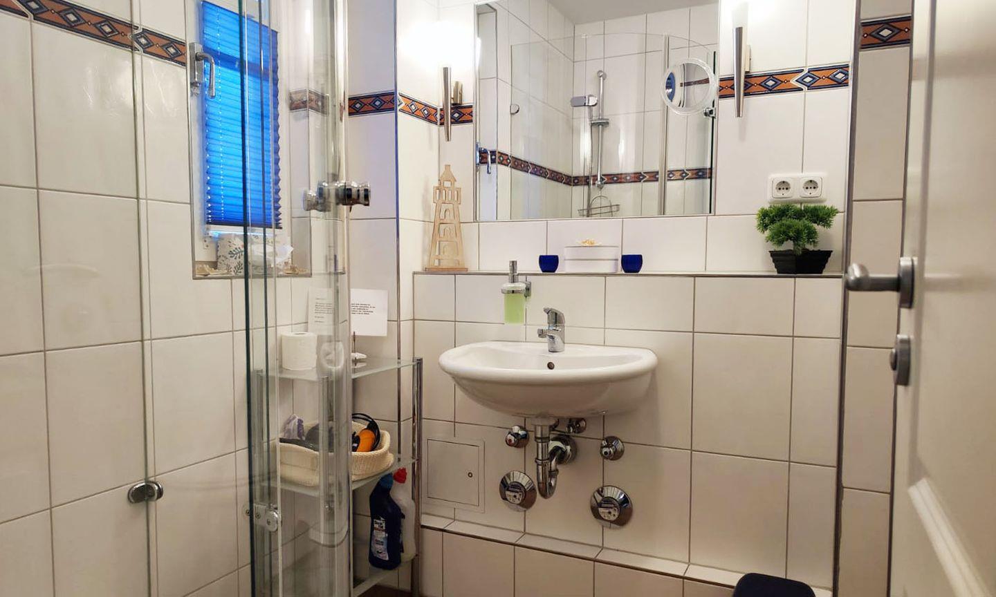 Im separaten Schlafzimmer – ebenfalls mit Fliesenboden – finden Sie einen angenehmen Ort zum Ausruhen. Das Badezimmer verfügt über Tageslicht (Fenster), WC, Waschbecken, Spiegel und Kosmetikspiegel sowie eine Dusche. Warmes Wasser und ein Haartrockner sind vorhanden. Für längere Aufenthalte ist die Ausstattung mit Waschmaschine (zur Eigennutzung) und Trockner besonders praktisch. Beheizt wird die Wohnung über eine Zentralheizung.