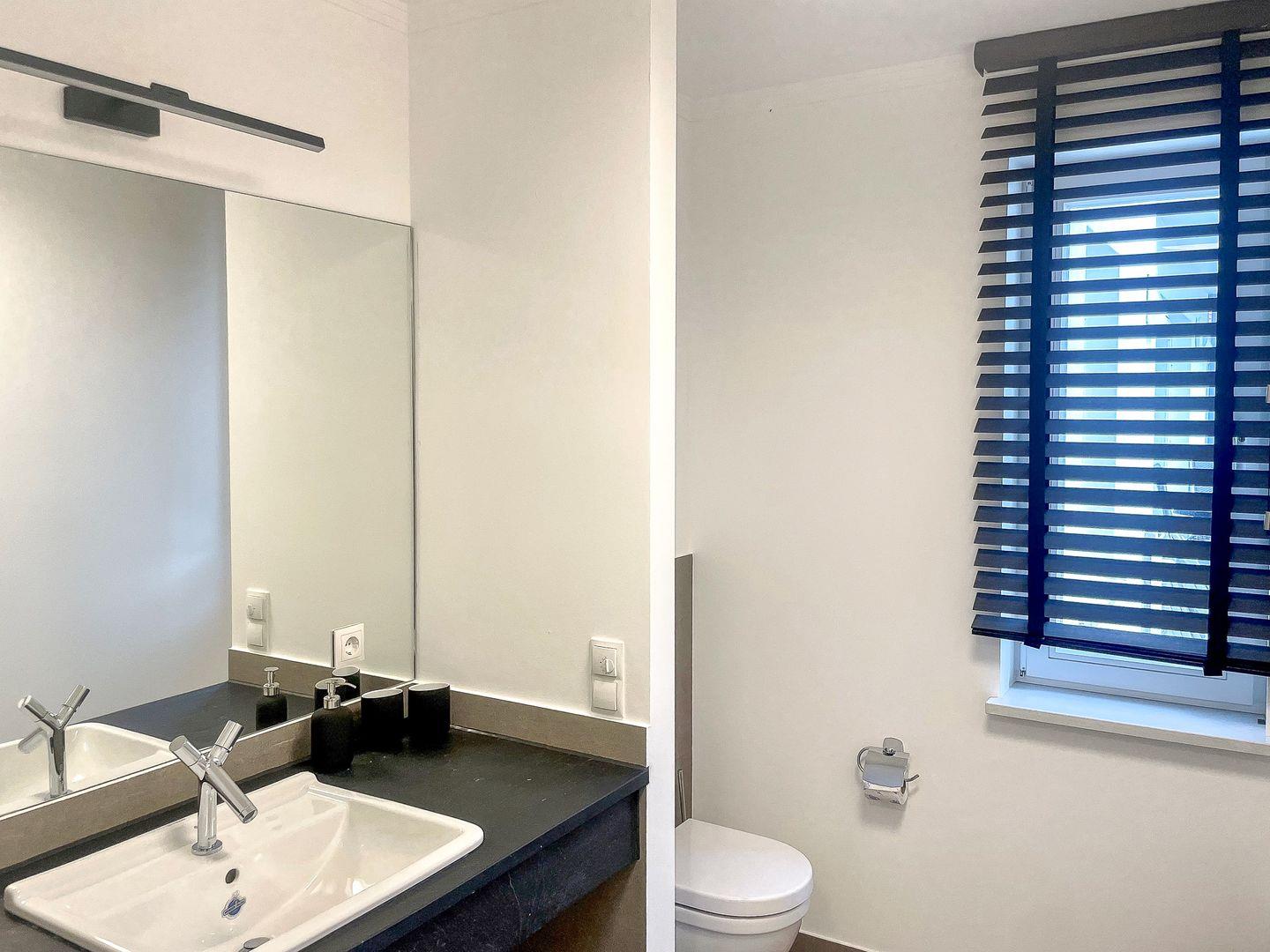 Das Tageslichtbad mit ebenerdiger Dusche ist mit einem großzügigen Waschtisch und einem Föhn ausgestattet.