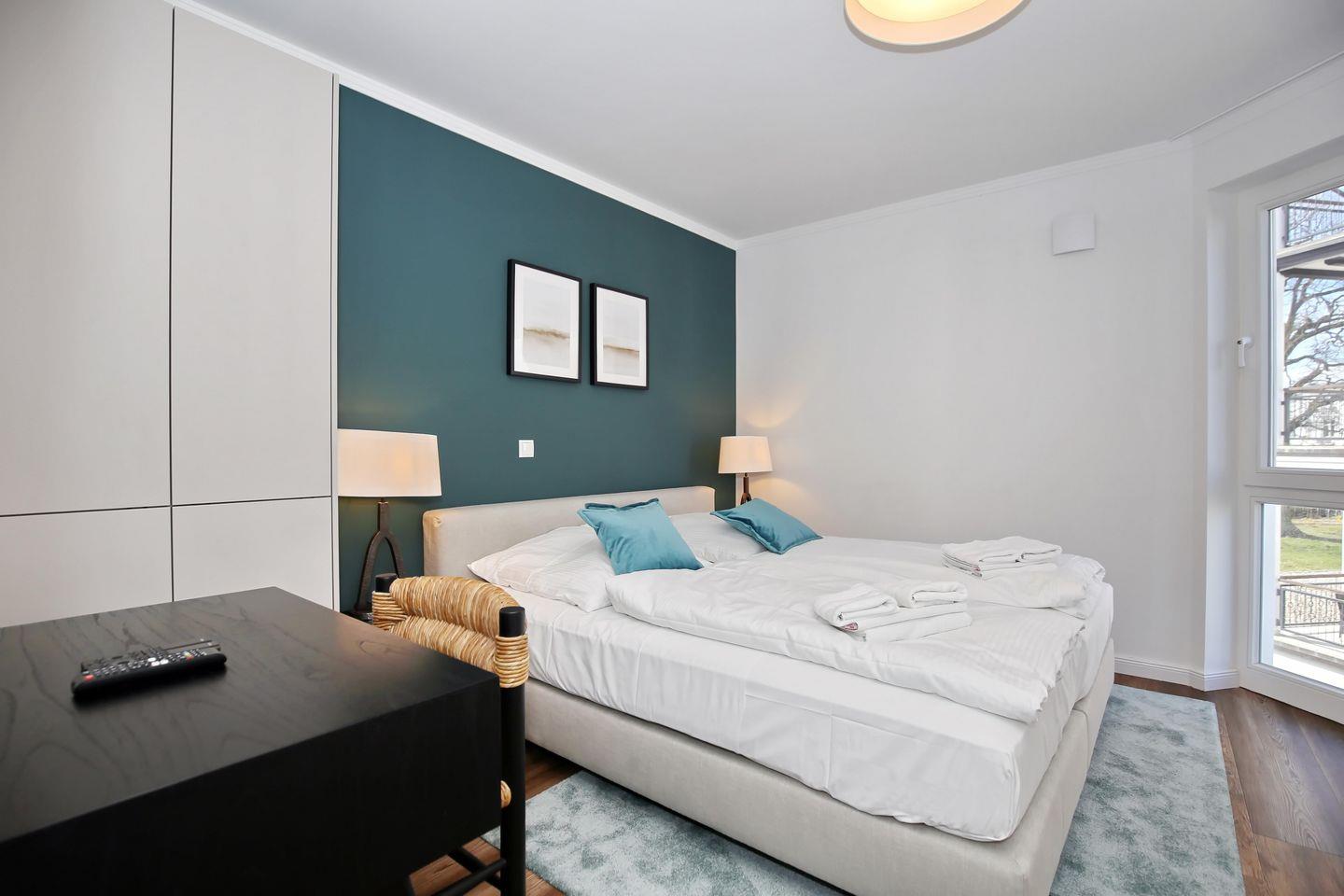 Das Schlafzimmer der Ferienwohnung ist mit einem komfortablen Boxspringbett (2 x 90 cm x 200 cm) der Marke Schramm eingerichtet. Für deine Garderobe bietet der Kleiderschrank ausreichend Stauraum. Zudem erwartet dich hier ein zweiter 43 Zoll Samsung 4K Flachbild-TV. Zur Verdunklung dienen blickdichte Vorhänge an den Fenstern.