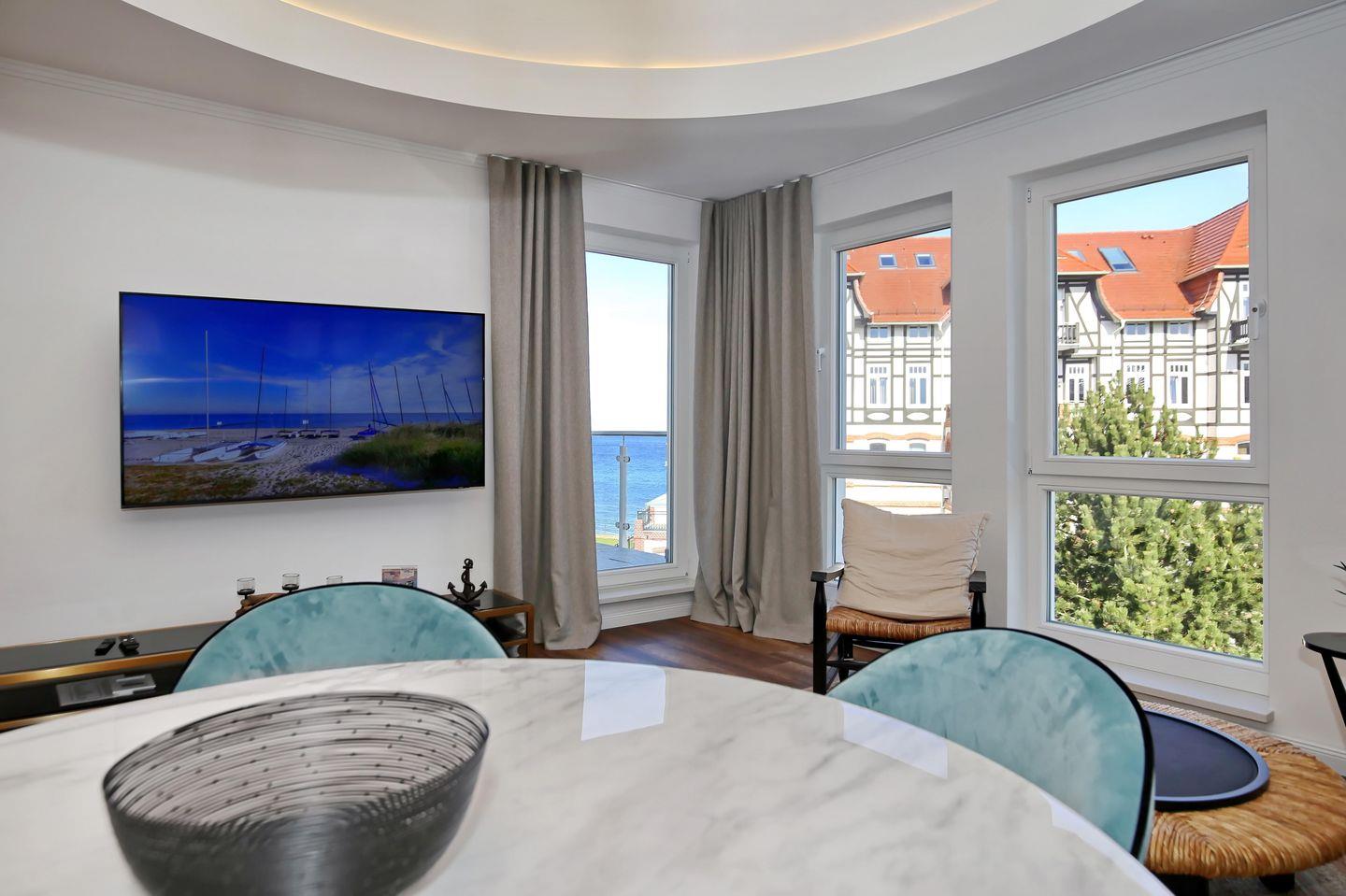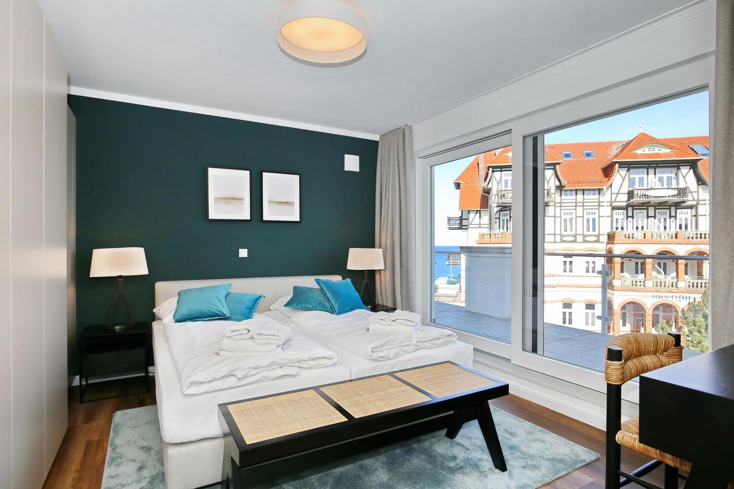 In diesem luxuriösen Penthouse ca. 62m² wird eine hochwertige Ausstattung großgeschrieben. Das moderne 2-Zimmer-Penthouse mit Nord-Ost-Ausrichtung befindet sich in der 2.Etage der Villa Siegfried und bietet bis zu 4 Personen einen erholsamen Urlaub an der Ostsee – nach nur ca. 50 Metern bist du direkt am Strand. Die Wohnung ist in einen Wohnbereich, einen kombinierten Ess- und Küchenbereich sowie einem Schlafzimmer und einem Tageslichtbad mit Dusche aufgeteilt. Auf dem großen Balkon kannst du entspannte Stunden mit einem wunderschönen Blick auf die Ostsee genießen.