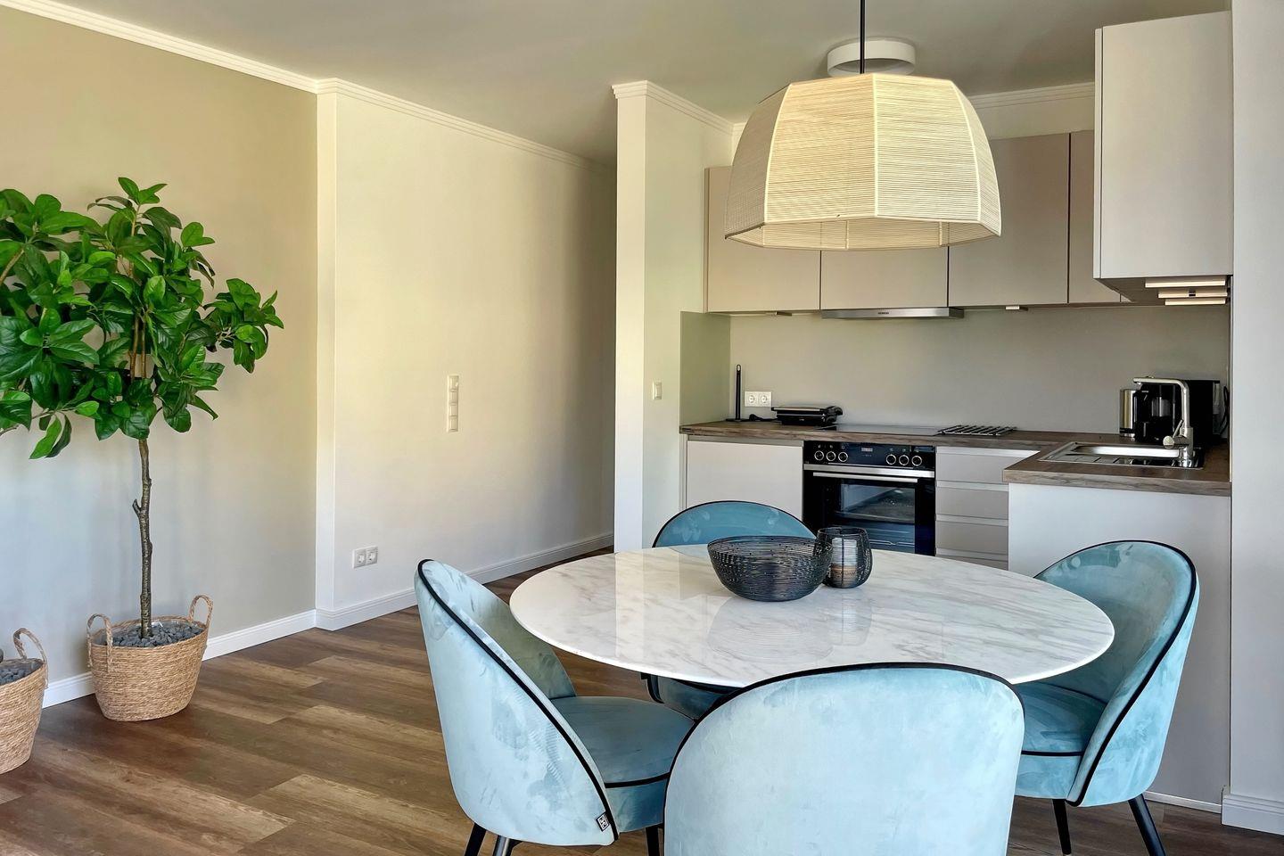 Die sehr hochwertige und exklusive Ausstattung des Penthouses ist für dich mit einer gemütlichen Schlafcouch (160x200cm) und einem 65 Zoll Samsung 4K Flachbild-TV eingerichtet und sorgt für eine stilvolle und gemütliche Atmosphäre. Der Essbereich ist im Wohnbereich integriert und bietet dir genügend Platz für gemeinsame Mahlzeiten.